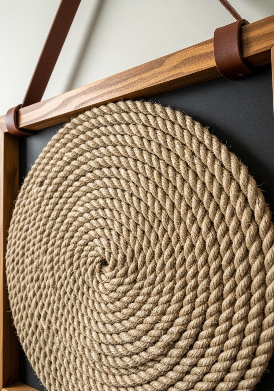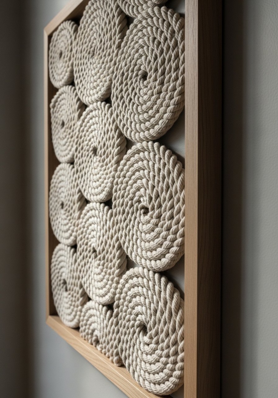A coiled rope panel framed in a shallow frame added instant texture to my entryway. I used jute rope and glued coils onto a 12×18 backing for a rustic, tactile piece. I recommend natural jute rope. Mistake: choosing too small a frame—the coils need breathing room. This DIY wall hanging warms a tight space and complements woven baskets or a seagrass bench.
