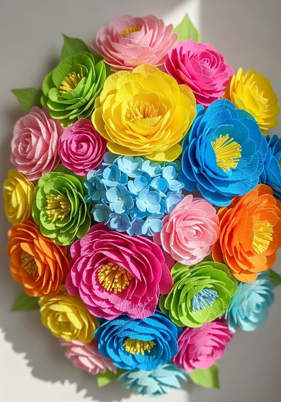 Paper flowers are lightweight, renter-friendly, and festival-ready. I made oversized blooms in coral and blush and anchored them on a 12-inch hoop to make a cheerful focal. I grabbed a crepe paper flower pack. Mistake: using thin paper that tears—choose thicker crepe or cardstock. This paper wall hanging adds movement and softens a corner without commitment. Great for seasonal displays and entryway pops of color.