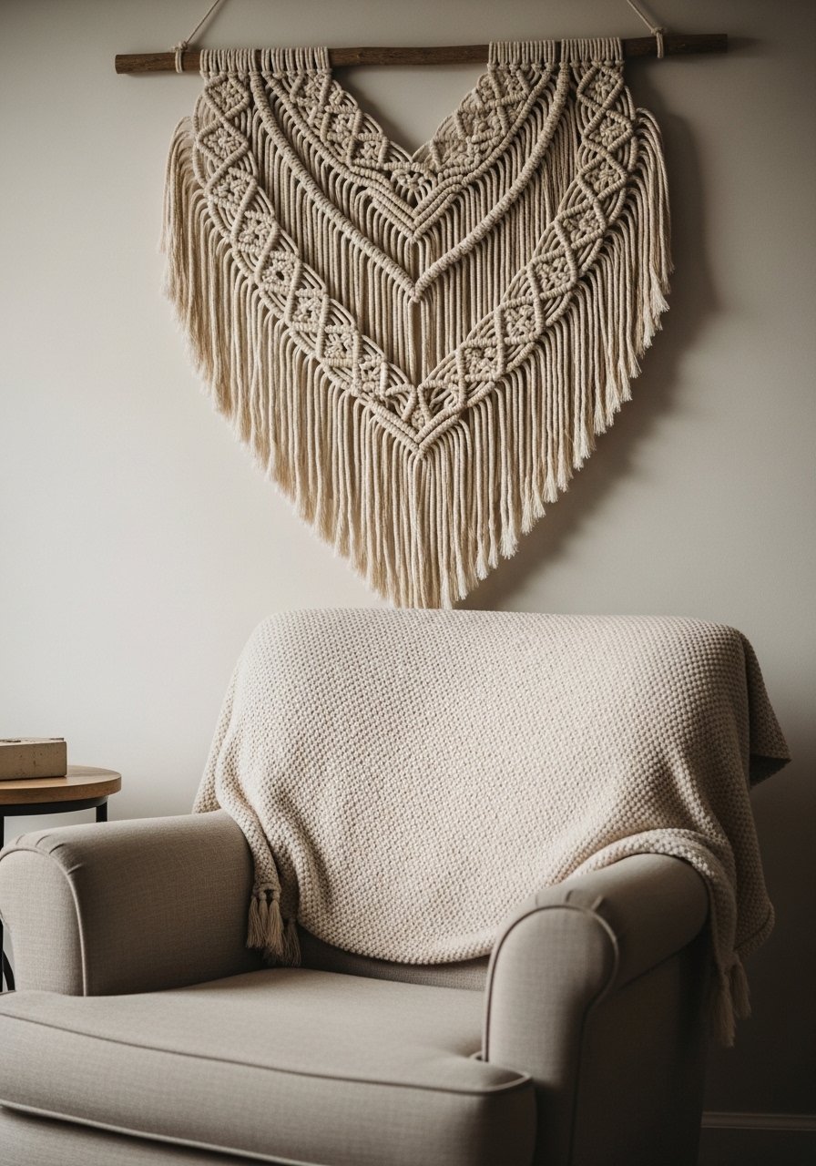 I tied my own heart-shaped macrame for a tiny reading nook. The 16-inch heart uses thicker macrame cord and a simple knot pattern for a soft silhouette. I used macrame cord, 4mm natural. Mistake: choosing a heart that's too small for a tall wall—it needs presence. This wall hanging feels personal and cozy, perfect for a bedroom or nursery where sentimental decor makes a corner feel like home.