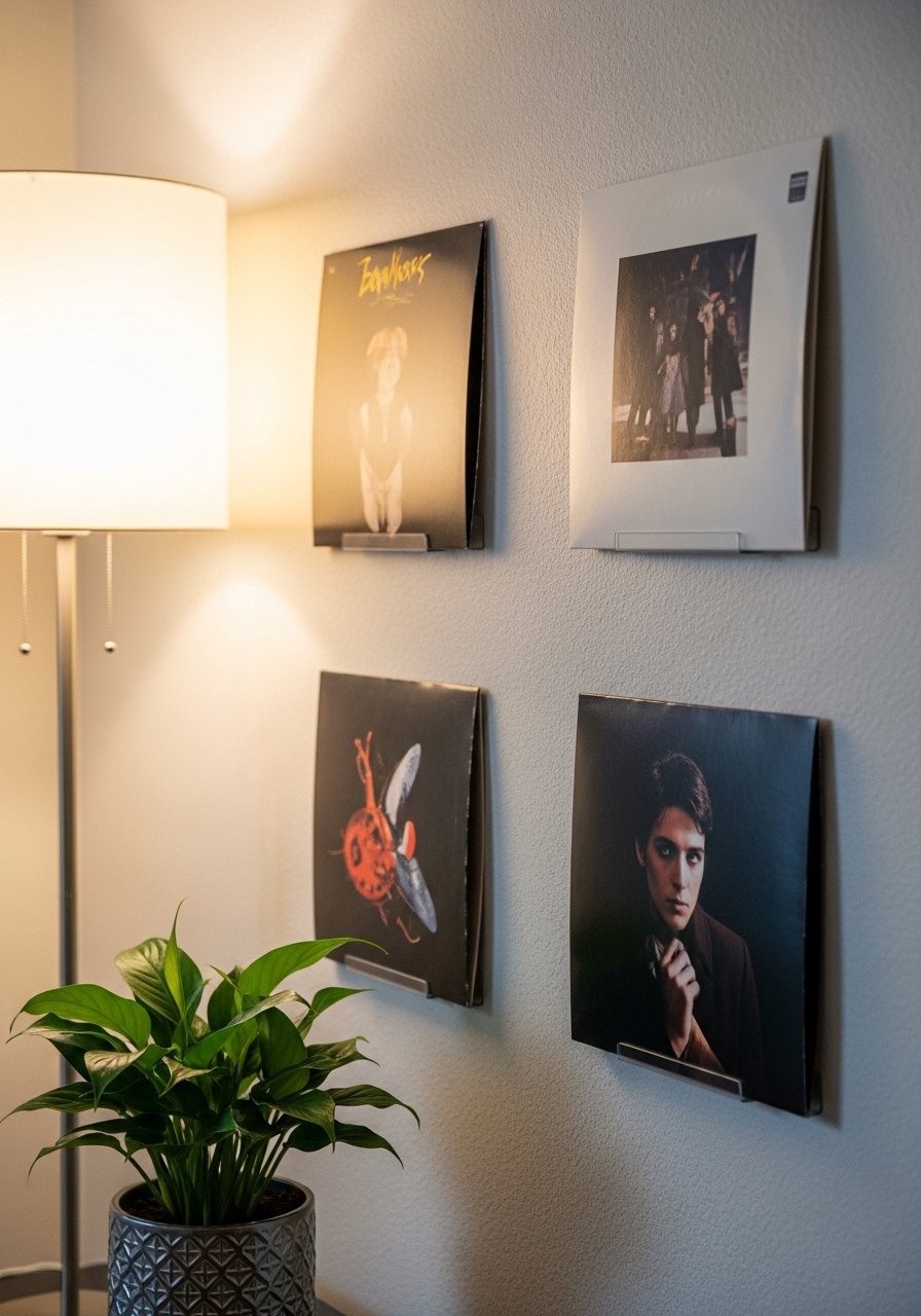 I mounted a few favorite album covers in floating frames for a sleek, music-first gallery. This treatment feels curated rather than cluttered when you pick three to five statement records. I used vinyl display frames. Mistake: putting too many small sleeves—larger scale gives impact. This wall hanging lets your personality show and pairs well with industrial or mid-century furniture.