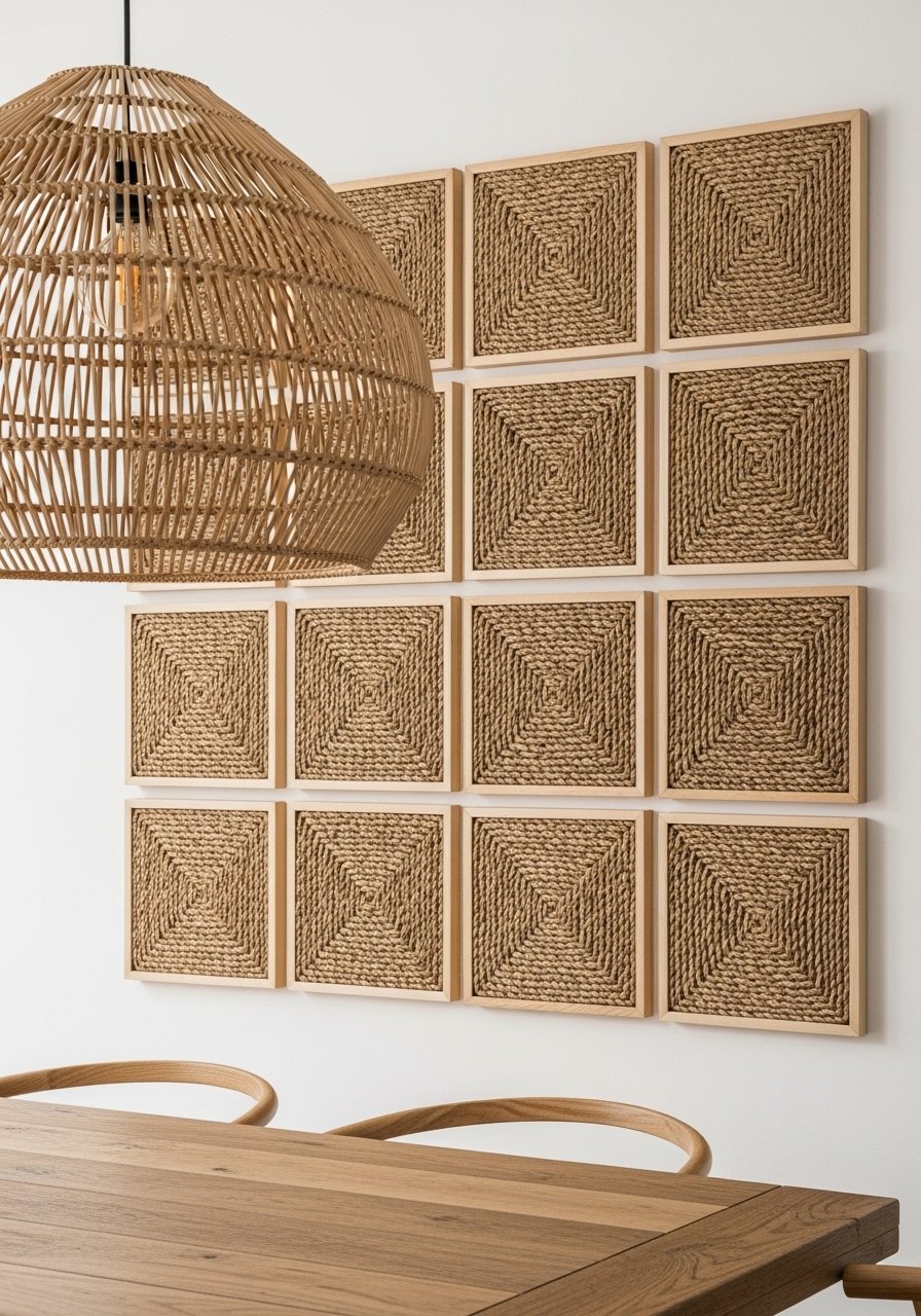 I framed seagrass mats in simple black frames to make a grid of natural panels above my dining table. The woven texture pairs with rattan lighting and warm wood. I bought seagrass placemat mats and trimmed them to fit frames. Mistake: using too many frame colors—stick to one frame finish. This wall hanging adds an organic backdrop for meals and mirrors the natural materials trend I keep seeing.