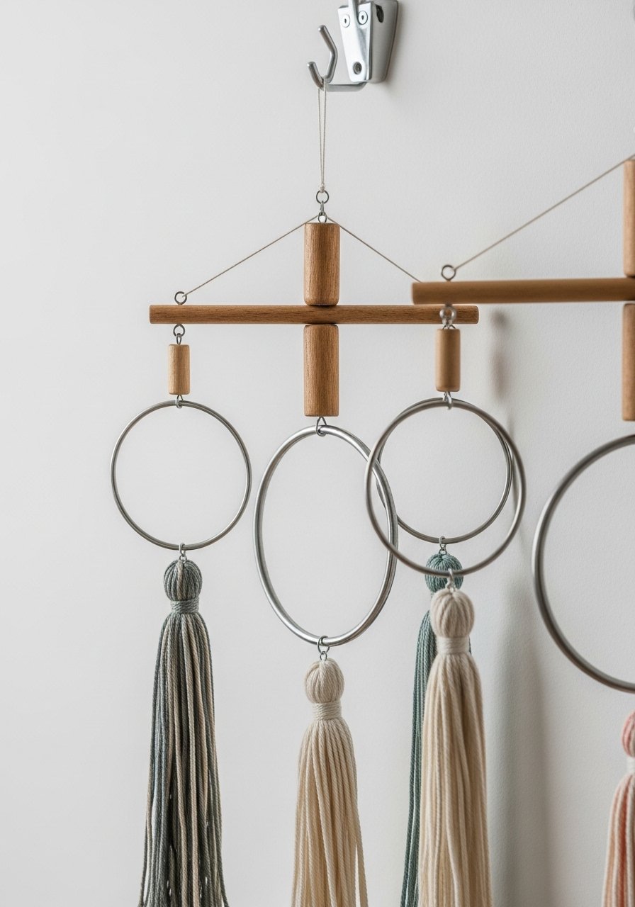 I made a mixed-material mobile using a small metal hoop, leather strips, and wood beads to hang near my desk. It adds motion and texture without needing floor space. I used wood bead garland and a 12-inch hoop. Mistake: making it too heavy for a single hook—keep materials lightweight. This DIY wall hanging is playful and ties together different room textures for an eclectic feel.