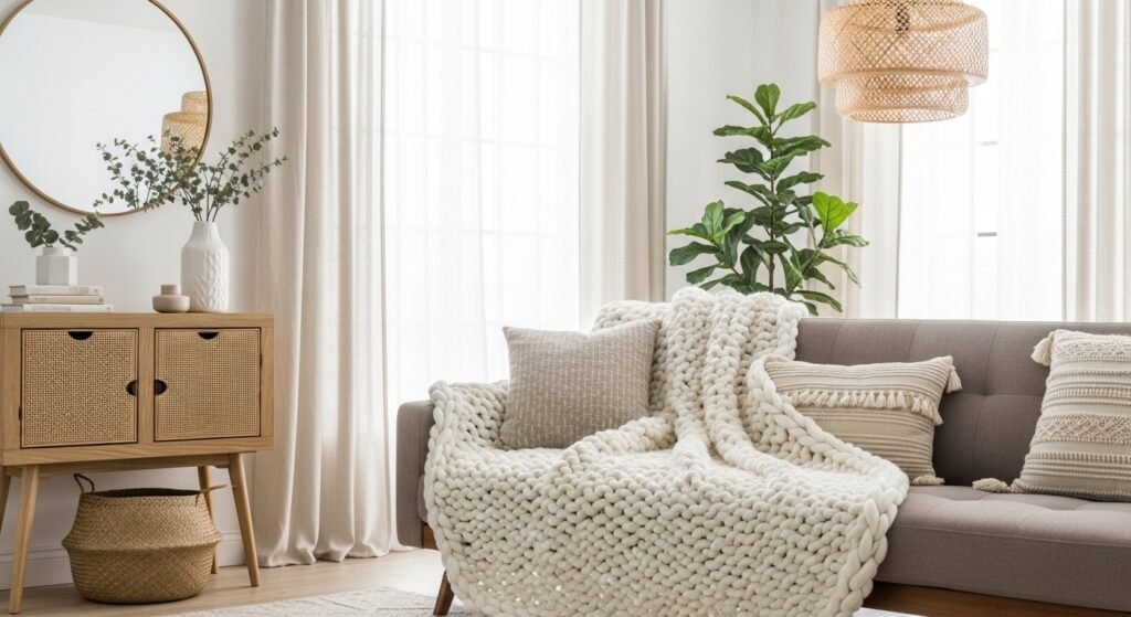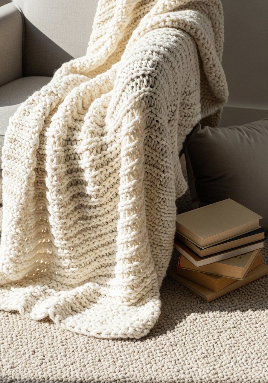 - Cream chunky knit throw blanket (~$35-55)