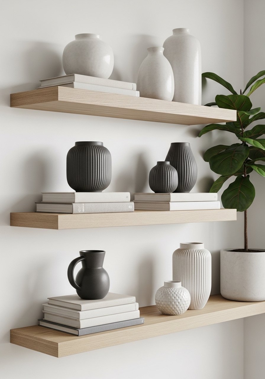 I installed three white oak floating shelves and styled them with a mix of books, a small artificial fiddle leaf fig, and ceramics. Group objects in odd numbers and vary heights to create rhythm. Don’t overcrowd: negative space makes each item feel curated. Floating shelves ground a blank wall and add vertical interest without heavy renovation — white oak keeps the look warm and current versus darker woods that date faster.