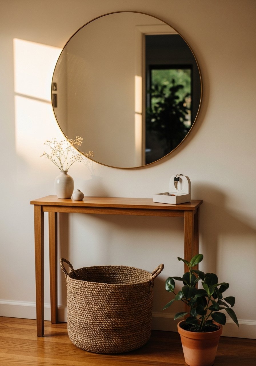 A 36-inch round mirror opened my narrow entry. I hung this 36-inch round mirror centered above the console so it reflects the window across the room. Mirrors add instant depth and feel practical for last-minute checks. Avoid tiny mirrors on wide walls — scale matters. Pair with a woven basket and a single table lamp for a composed vignette that reads intentional, not thrown together.