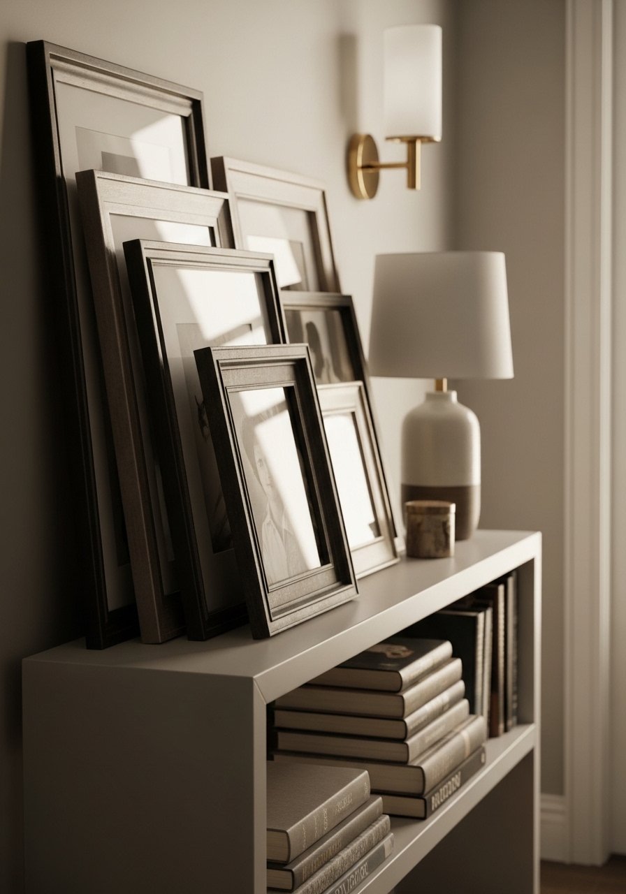 I created a relaxed gallery by thrift-hunting frames and swapping in crisp new mats. Thrifted frames gain polish when paired with fresh white mats — I use white picture mats, 11×14. Lean frames on a shelf instead of hammering nails for more flexibility. The common mistake is matching everything; mixing metals and patina gives depth. This approach fixes one of the biggest pain points: fear of permanent holes in rental walls.