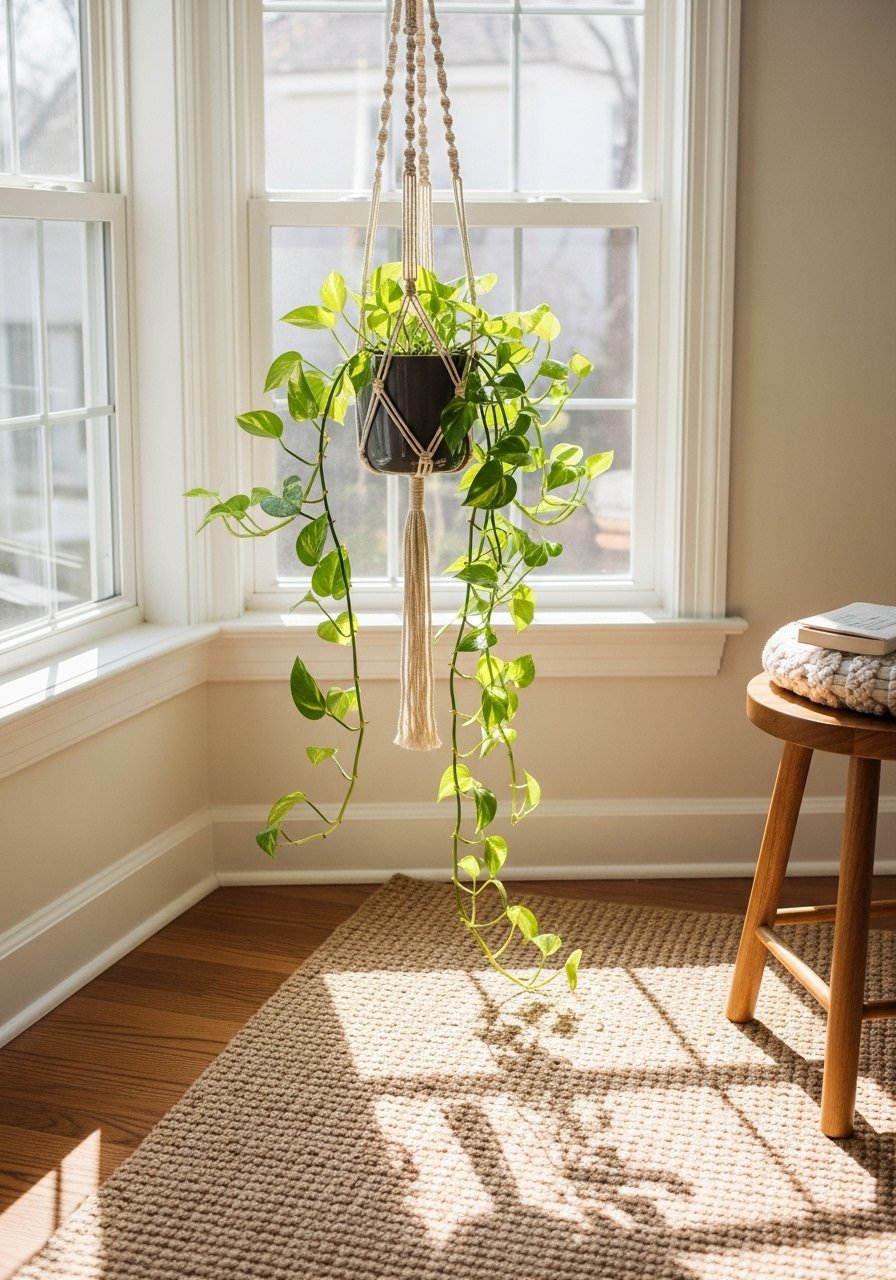 Hanging plants frees up surfaces and adds vertical movement. I used a neutral macramé plant hanger with a real pothos for low maintenance. Suspended greenery draws the eye upward and solves cramped-surface pain. The mistake is too-large pots in small rooms — pick a lightweight terracotta or plastic liner. I’ve noticed people returning to organic textures; a simple hanger gives a calm, lived-in boho vibe.