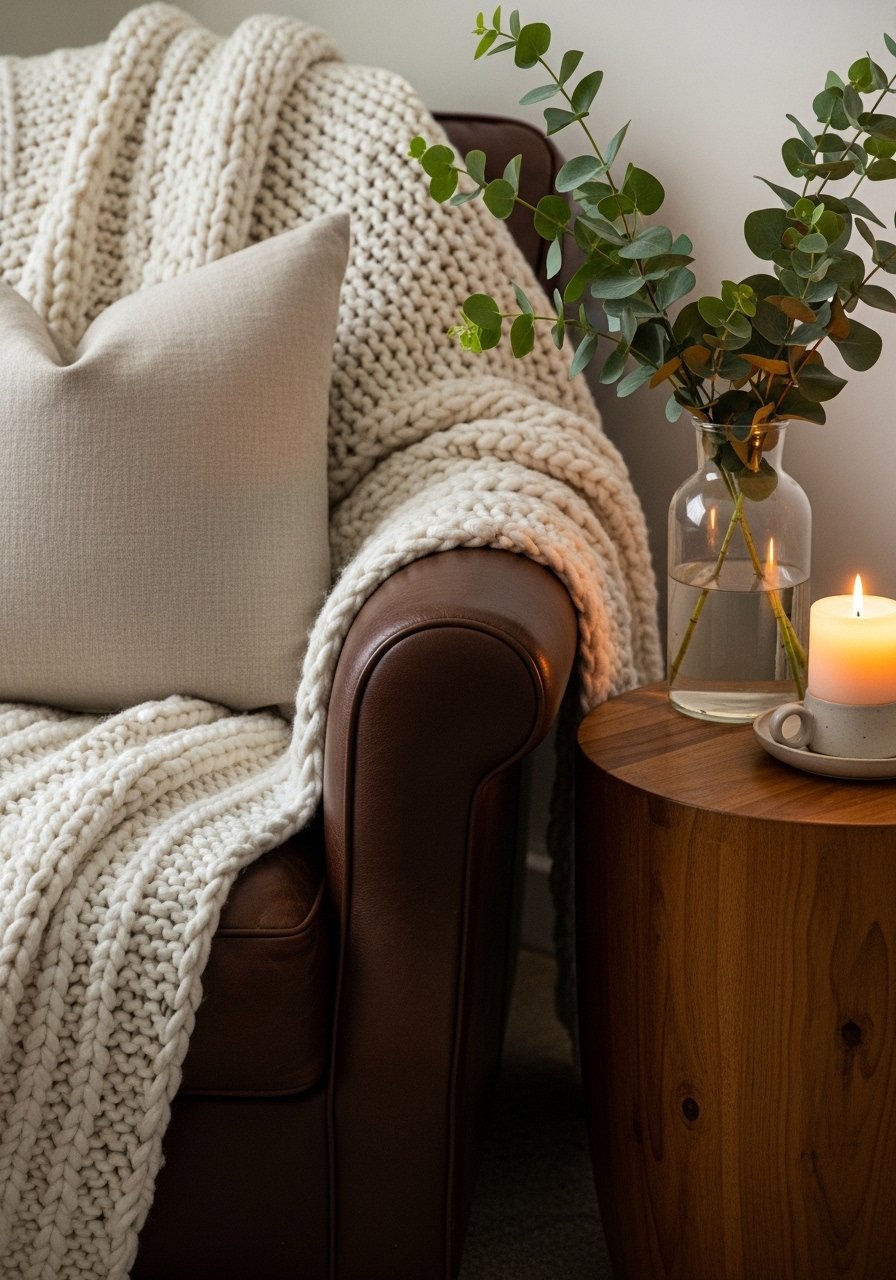 I built a small reading nook with layered textiles and one greenery accent. I draped this cream chunky knit throw over the arm and added a linen pillow for texture. The look feels very cozy winter living room without being festive. Keep the palette to warm neutrals and add an eucalyptus stem in a bud vase for life. Avoid overloading patterns — one pattern plus solids keeps the space calm and lived-in.
