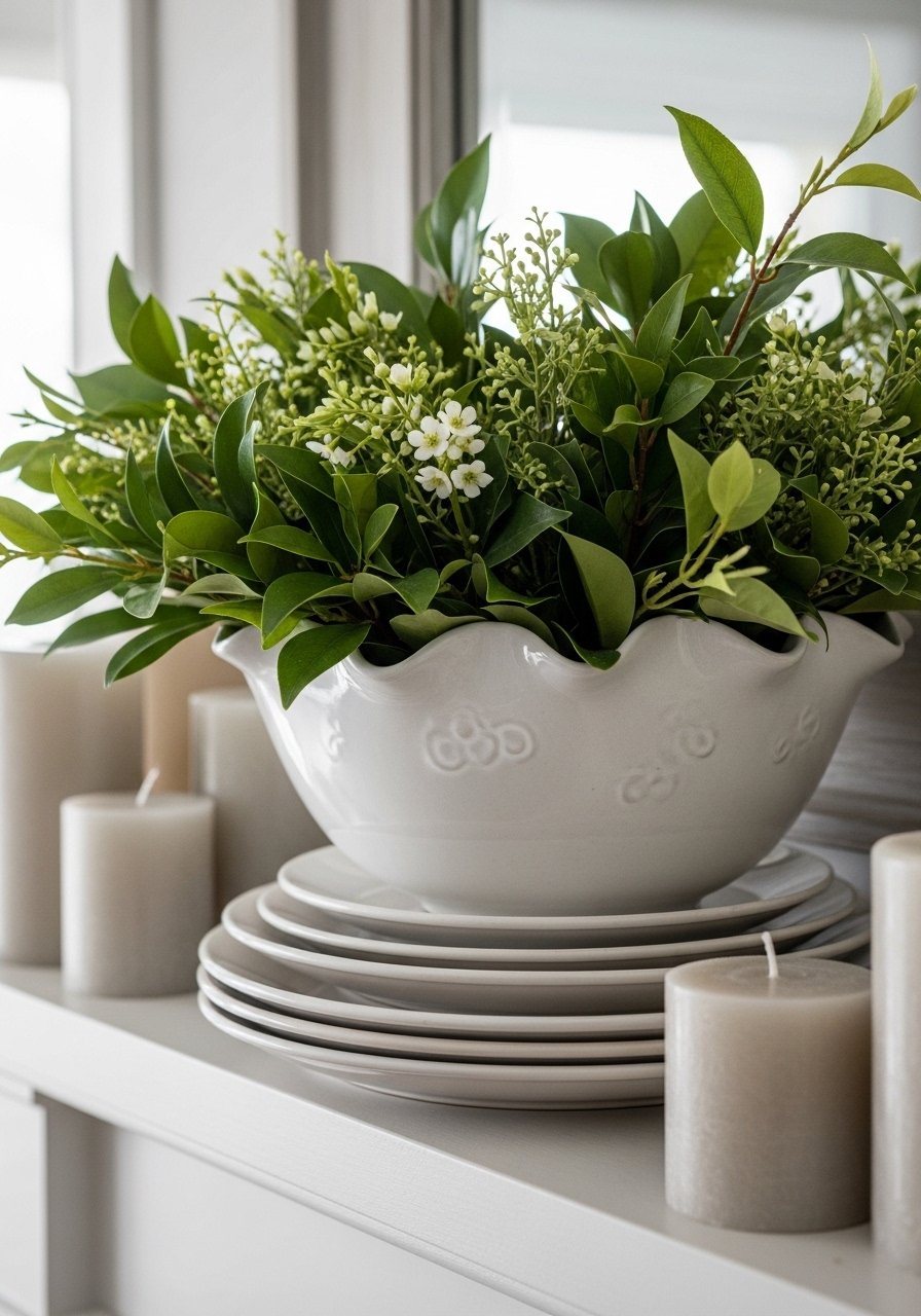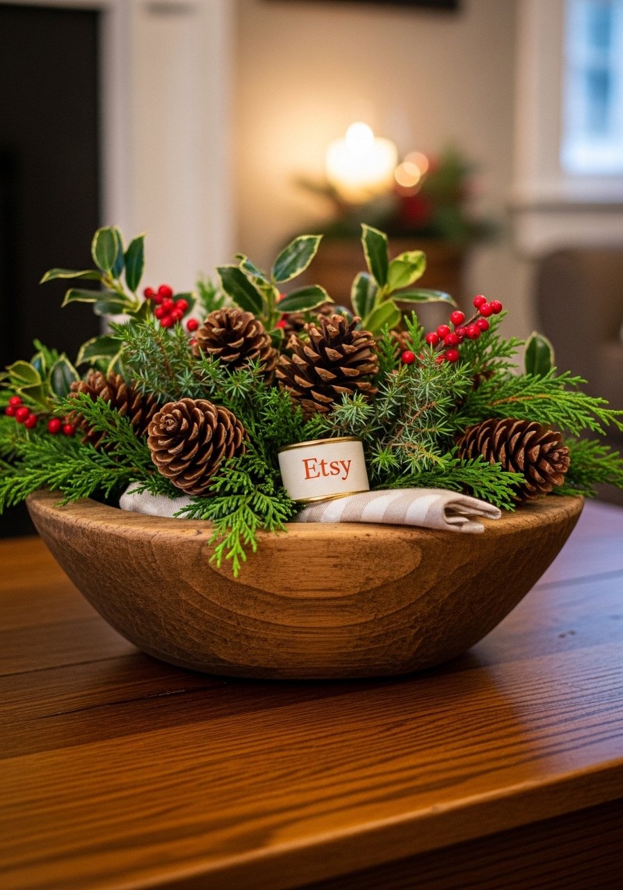Ruffled bowls are my go-to when I want depth without fuss. I placed a ruffled bowl on layered chargers and filled it with winter greens and small pinecones. The repeating texture adds interest without extra color. I like this wooden dough bowl for larger arrangements and a smaller ceramic ruffled bowl for mantels. Avoid tall, busy stems that hide the bowl’s texture — keep stems cropped to show the ruffle detail.