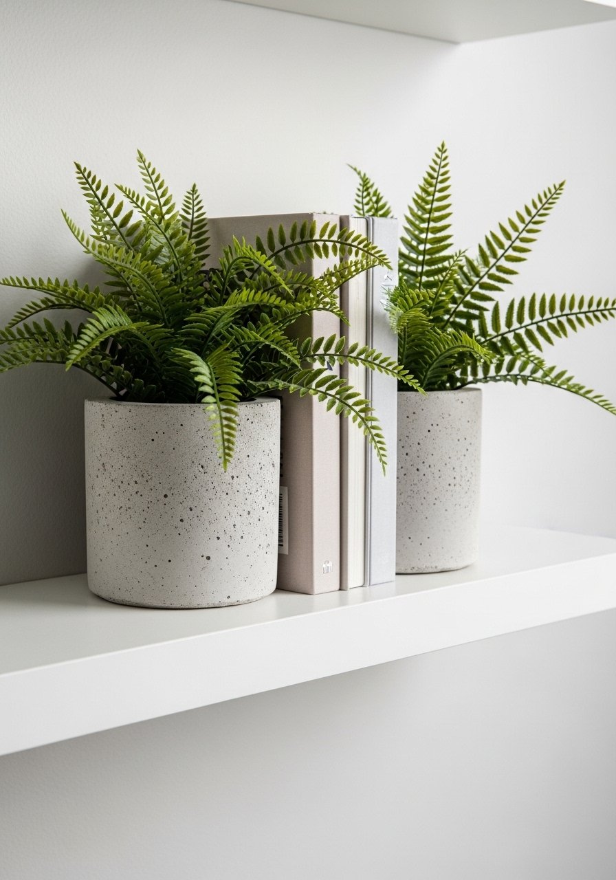 Cement Pot Bookends with Faux Ferns for Minimal Shelving