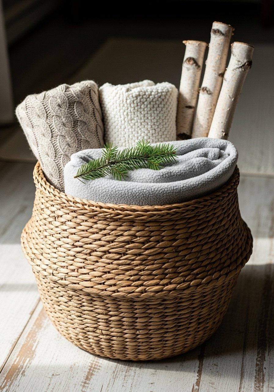 If a corner is staring back at you empty post-holidays, tuck blankets and birchwood into a woven basket. I use a large basket with folded chunky knit throws and add one or two birch logs for texture. It solves clutter vs. cozy — blankets are stored but accessible. Don’t pack the basket so tightly that the throws lose their inviting look; a slightly lived-in feel is the goal.