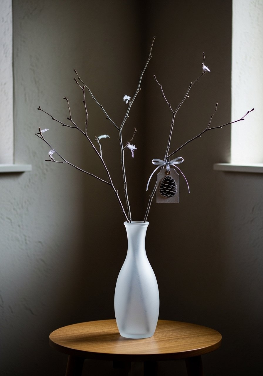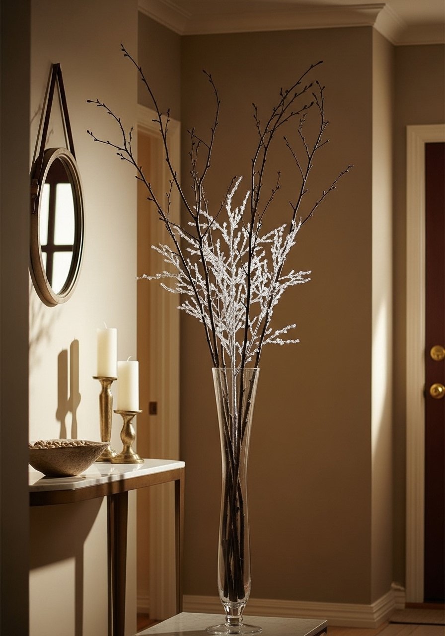 I like icy picks mixed into branchy stems for a touch of winter without holiday overkill. A few led-edison-bulbs-warm-white nearby on a console lamp warms the look. Keep the picks sparse and varied in height for organic texture. Common mistake: too many picks that read plastic; less is more. This keeps the vibe organic and neutral winter decor-friendly.