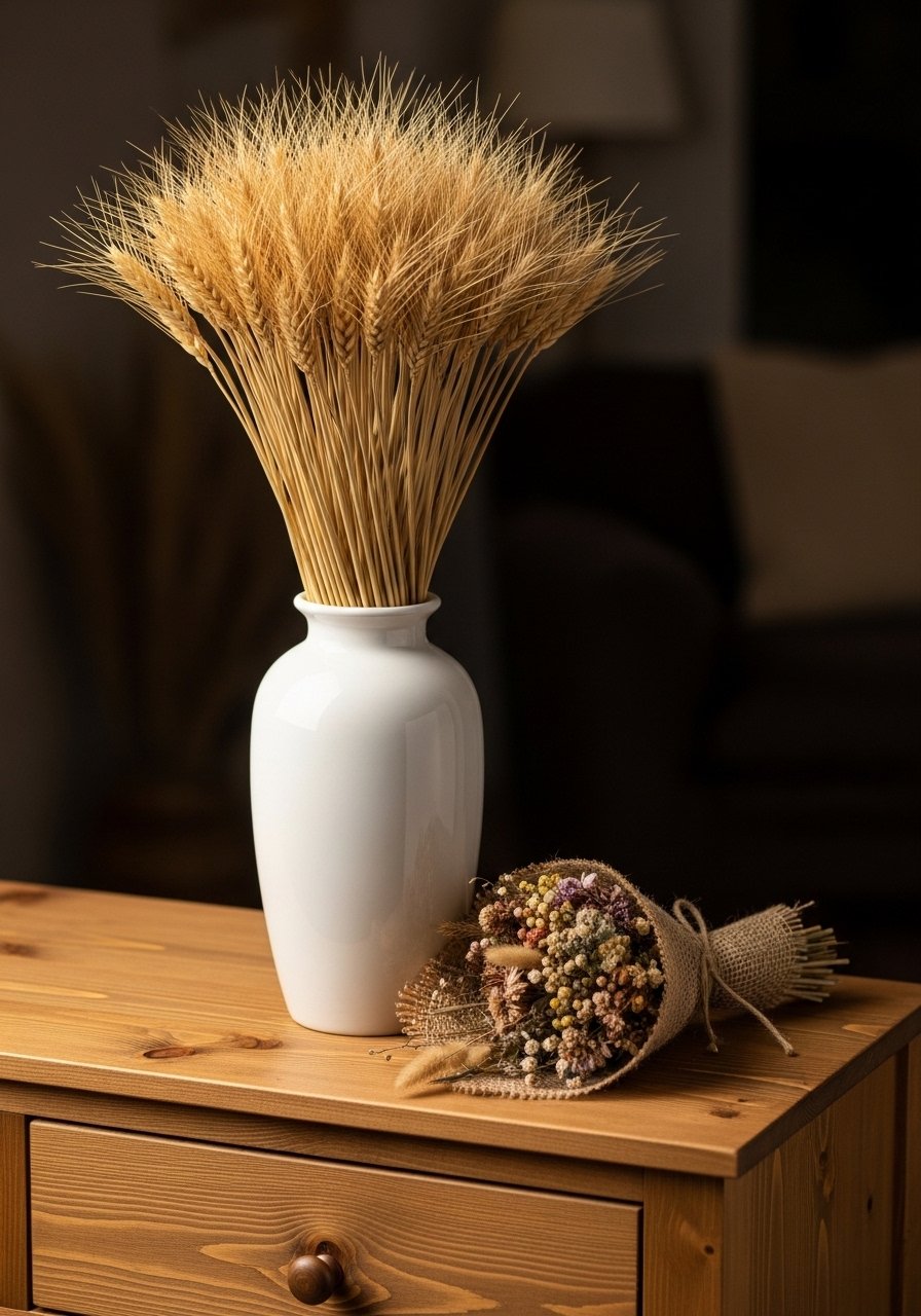 Dried wheat brings a sustainable, tactile feel to winter decor. I swap fresh stems for a dried-wheat-bouquet in winter — no watering, just texture. Pair with exposed wood and neutral ceramics for a calm, earthy vignette. Watch for dust if you have pets or kids; place dried stems slightly out of reach and dust lightly with a feather duster to keep them fresh-looking.