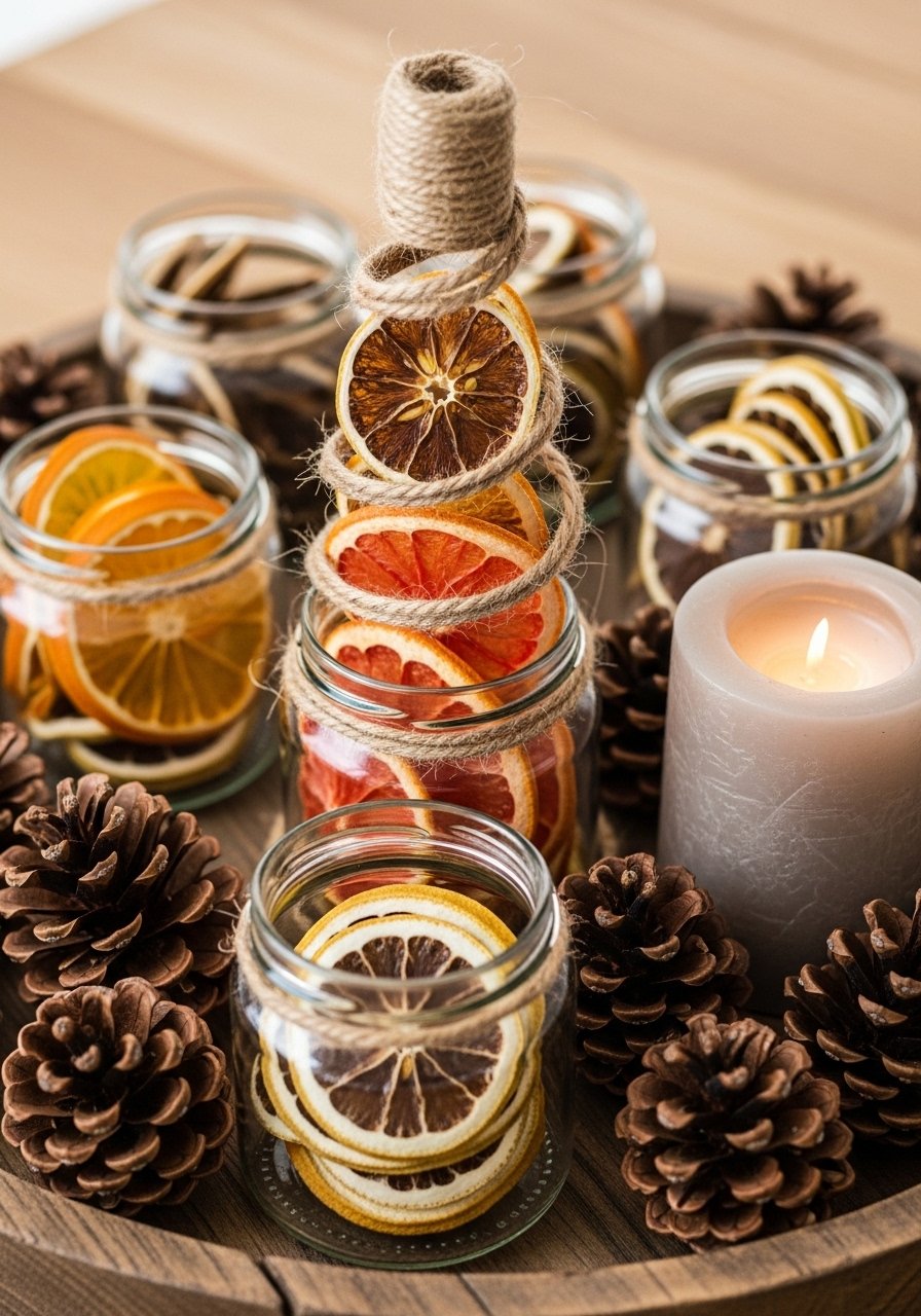 Dried citrus is an underused winter detail that adds a hint of scent and warm color without holiday kitsch. I threaded slices into jars and layered them with pinecones for a dried-citrus-garland effect. It reads curated and fresh. Avoid strong essential oils that compete; the citrus has enough presence. This is ideal for small winter decor updates that make a room feel intentional post-Christmas.