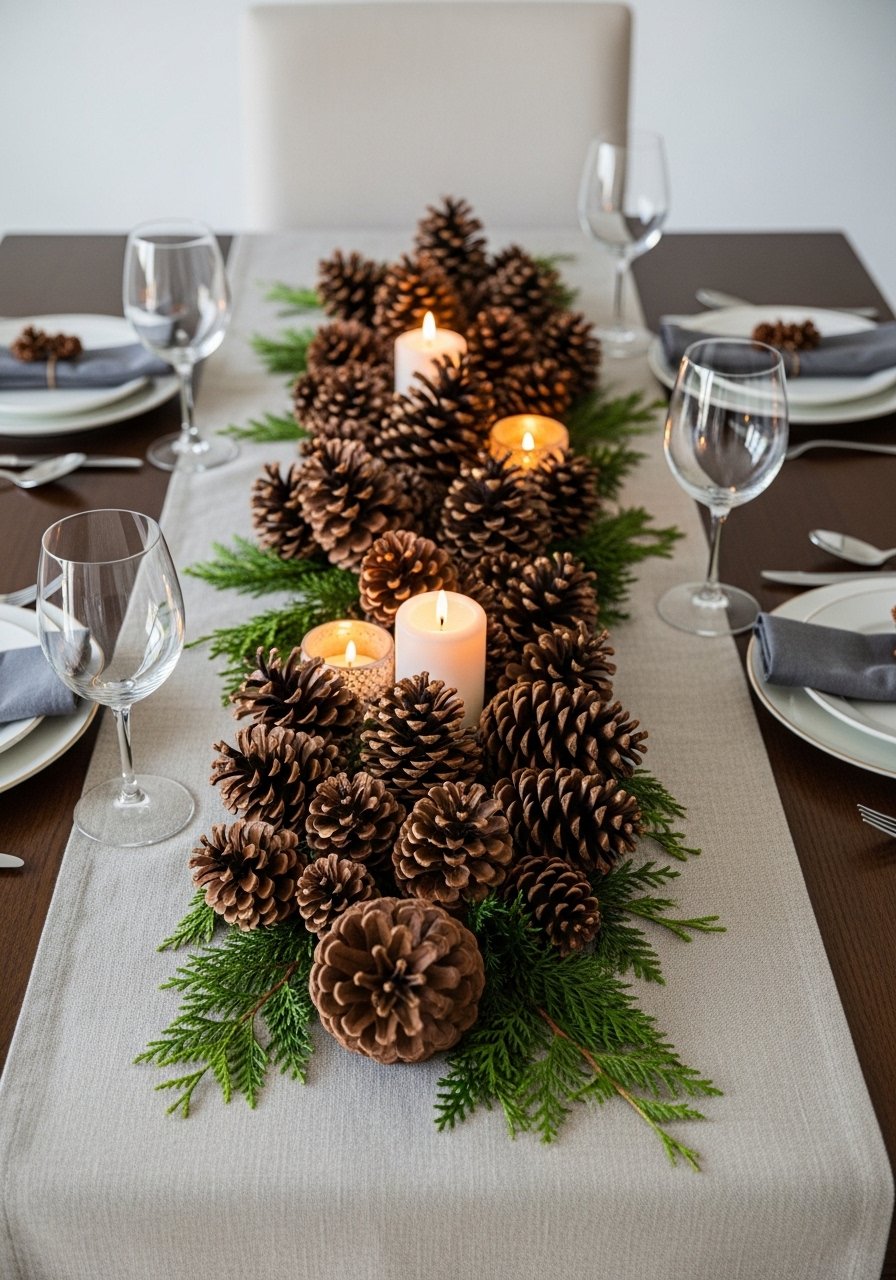 Neutral Table Runner with Pinecone Accents for Rustic Centering