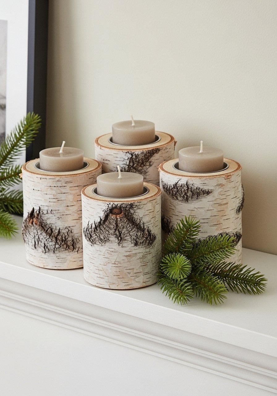 I made simple birch log holders to add warmth and texture to the mantel. Use uniform diameter logs and led-edison-bulbs-warm-white nearby for complimentary light. The logs ground the mantel and pair well with a round mirror. Keep candle sizes proportionate — too-tall candles look clumsy. This is an easy upcycle that leans into the sustainable winter trend while keeping things neutral and tactile.