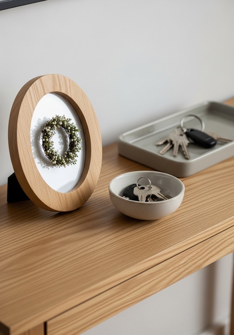 A: Clear holiday clutter and keep a round mirror, a couple of pillar candles, and small greenery sprigs. Add a wooden-dough-bowl-large with pinecones for a low-cost focal point.