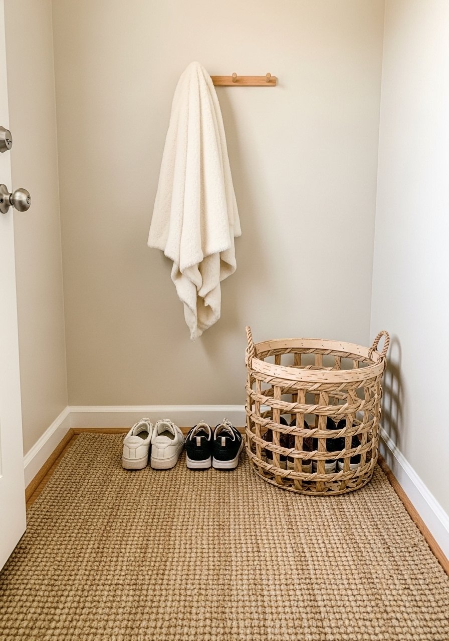 A: A birchwood basket for scarves and a low-pile rug anchor the space. Pair with a small mirror like large-round-mirror-36-inch to open the area visually.