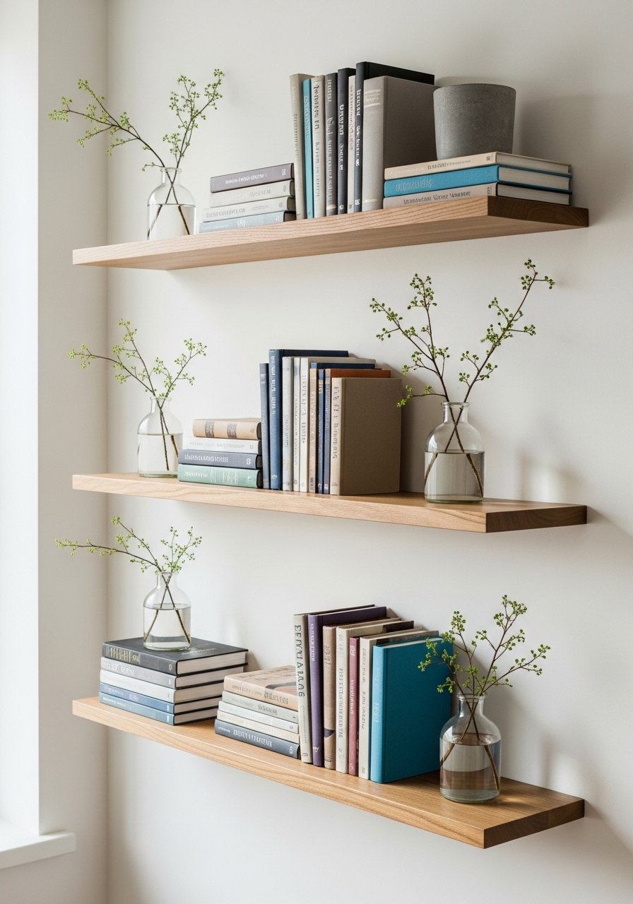 If your shelves look flat, swap short boxy stems for branchy stems to create depth. I put branchy stems in small vases across my white oak floating shelves for height variation and visual flow. Pair with a floating-shelves-white-oak-set-3 to match the warm wood trend I’ve noticed everywhere lately. Avoid stuffing shelves — leave breathing room and use odd-numbered clusters for rhythm.