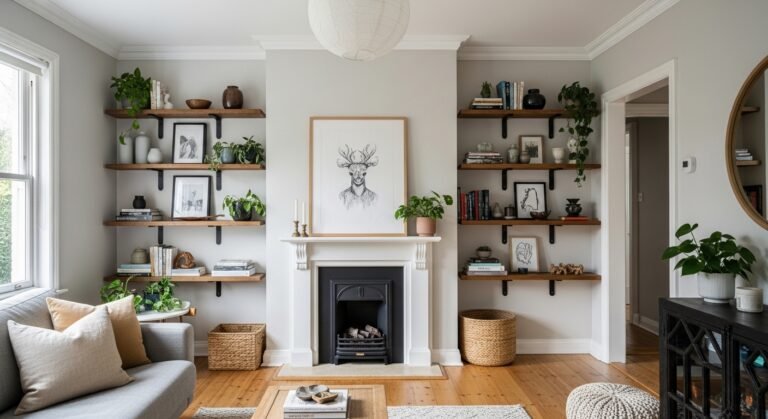Read ArticleA real, lived-in living room showing the final result of DIY wall shelves installed and styled. Natural daylight, soft shadows,