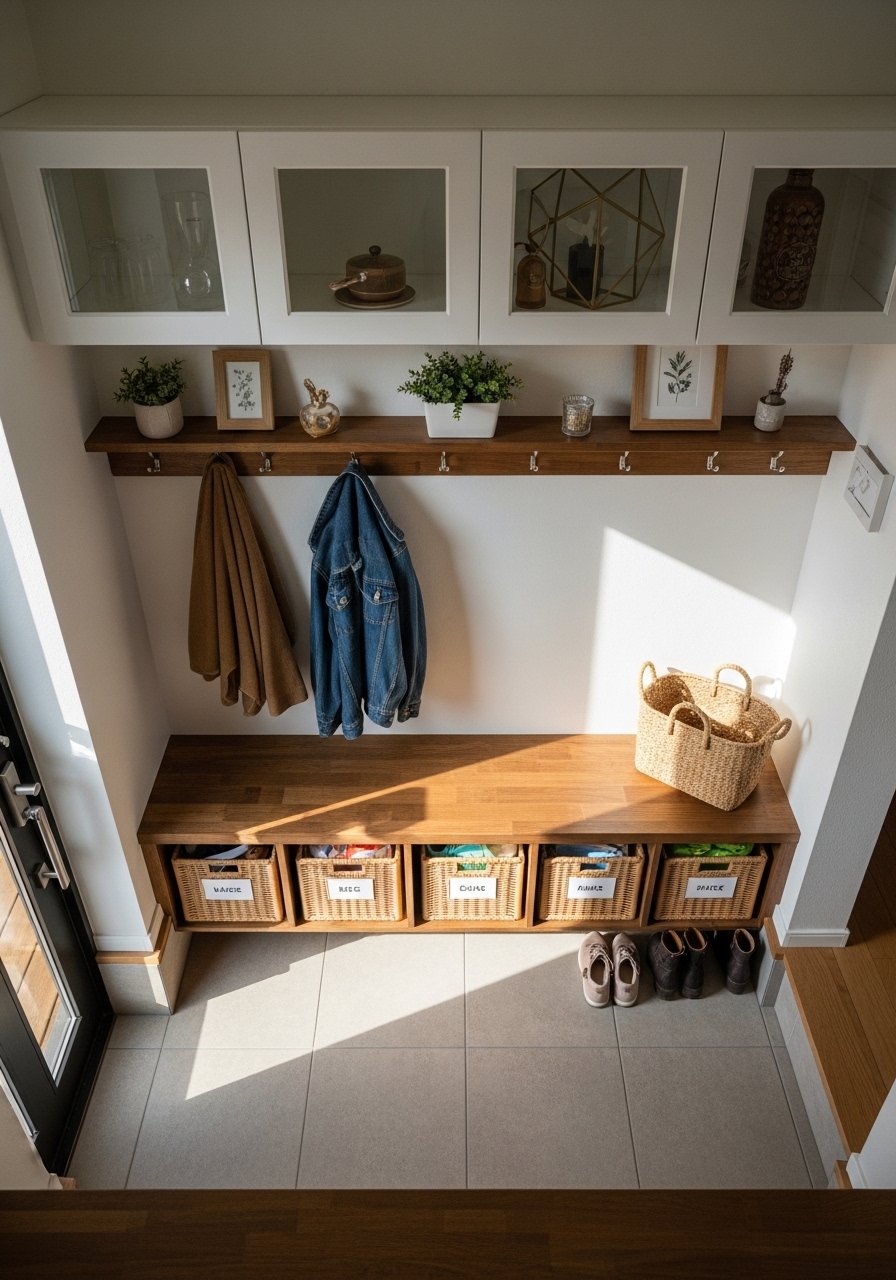This is where the room starts to feel usable. I group functions, not things. Landing zone for keys and mail, daily wardrobe zone for bags and coats, and a supply zone for pantry overflow. Visually it reads as calm when each zone has one primary container, one hanging spot, and one decorative object.