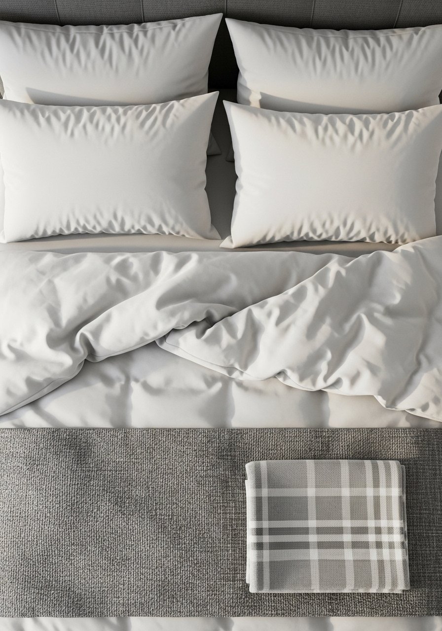 I layer bedding in thirds to get proportion right. Two euro shams in back, two sleeping pillows in front, then a decorative pillow or lumbar. The duvet goes to the mattress edge, but I fold the top third down to show sheets and texture. A throw folded across the foot, one third of the bed length, adds a finished look.