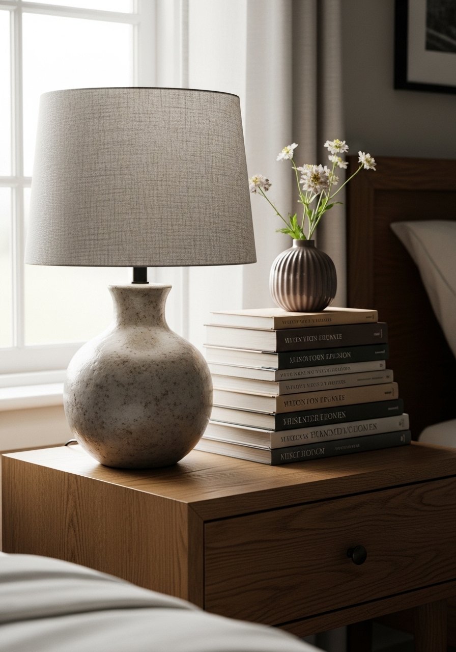 I style each nightstand with a trio of items. One taller item, like a lamp, one medium item such as a book stack, and one low accessory like a ceramic vase. Lamp height matters. My lamp base plus shade centers around 26 to 30 inches from the tabletop. If a lamp is too tall it overwhelms the headboard.