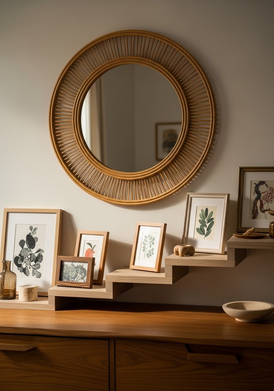 I use a mirror or a single large artwork to stop the wall from reading flat. A rattan mirror brings texture and reflects light, making the room feel larger without clutter. Underneath, I add staggered picture ledges with leaned frames for a collected look that’s easy to edit.