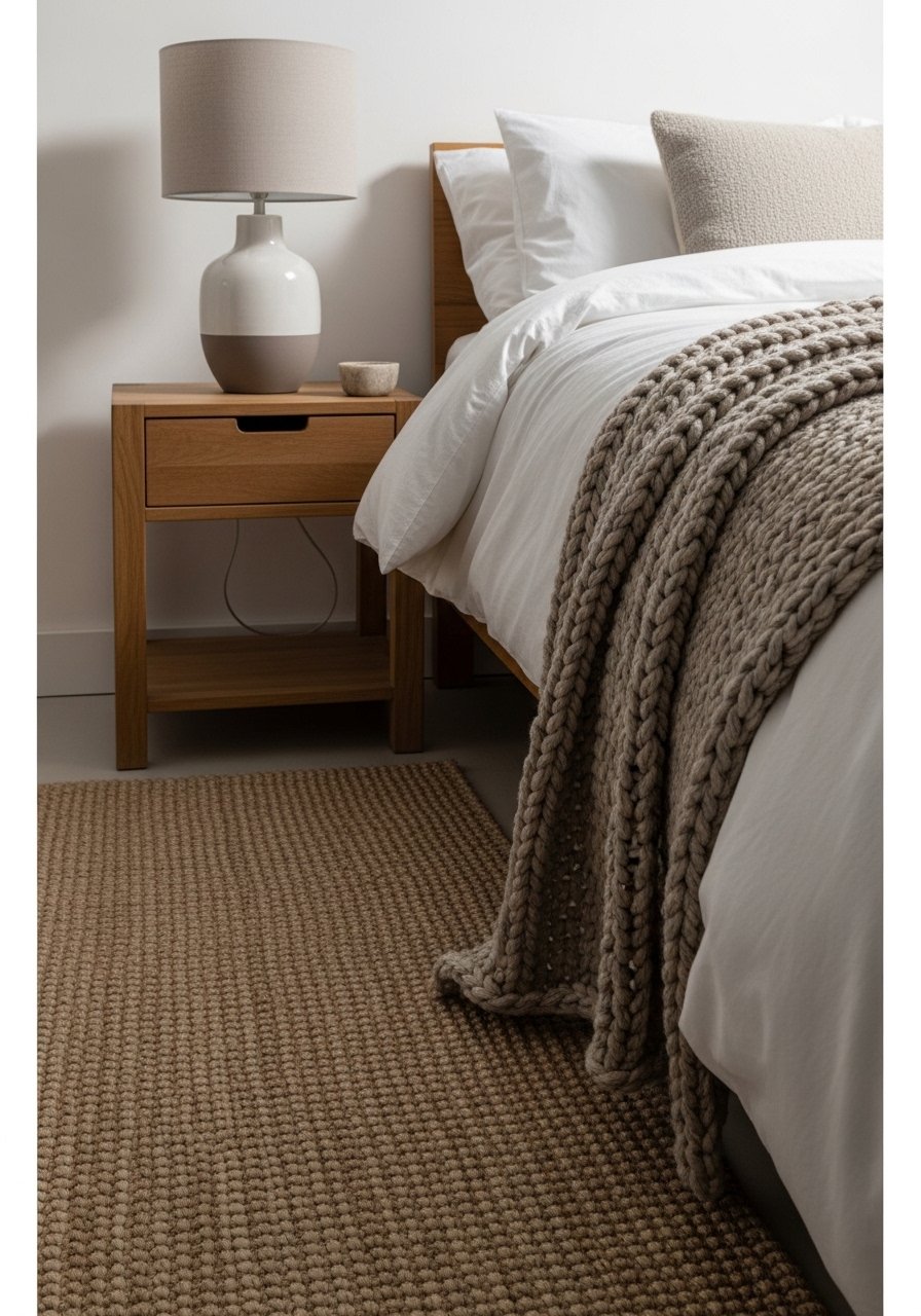 I always add a textured rug that at least reaches under the front two-thirds of the bed. It anchors the furniture group and warms the floor visually and physically. Then I add a chunky throw and a lamp on the bedside table—soft textures and warm light make the room feel lived-in.