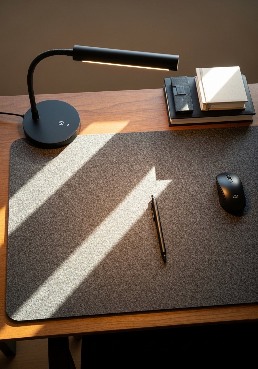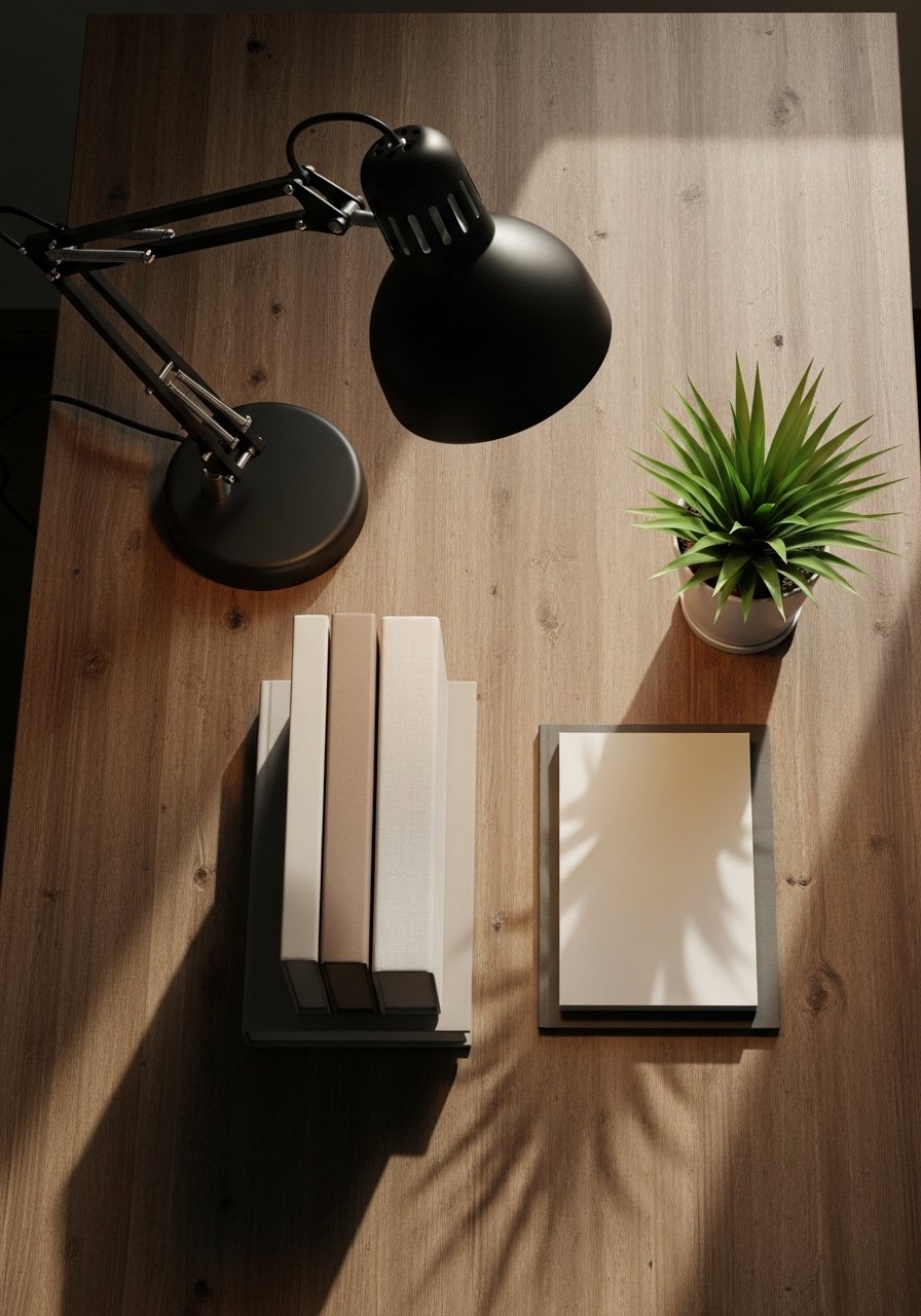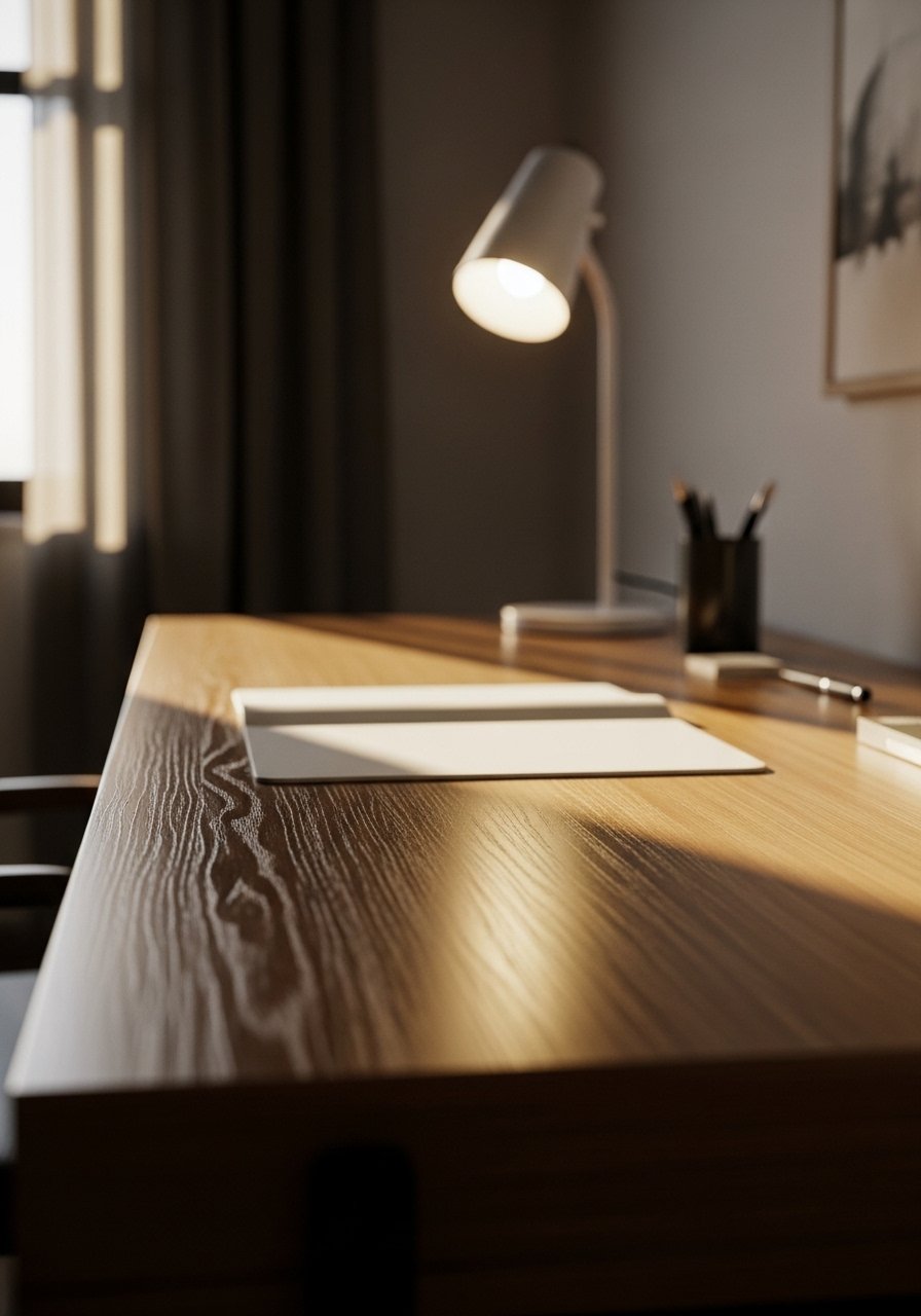 Add the lamp on the dominant side of use. If you are right handed, place the lamp left of center. That prevents shadows. The desk looks finished now. The pad and lamp form a single plane. Everything else can read against them.