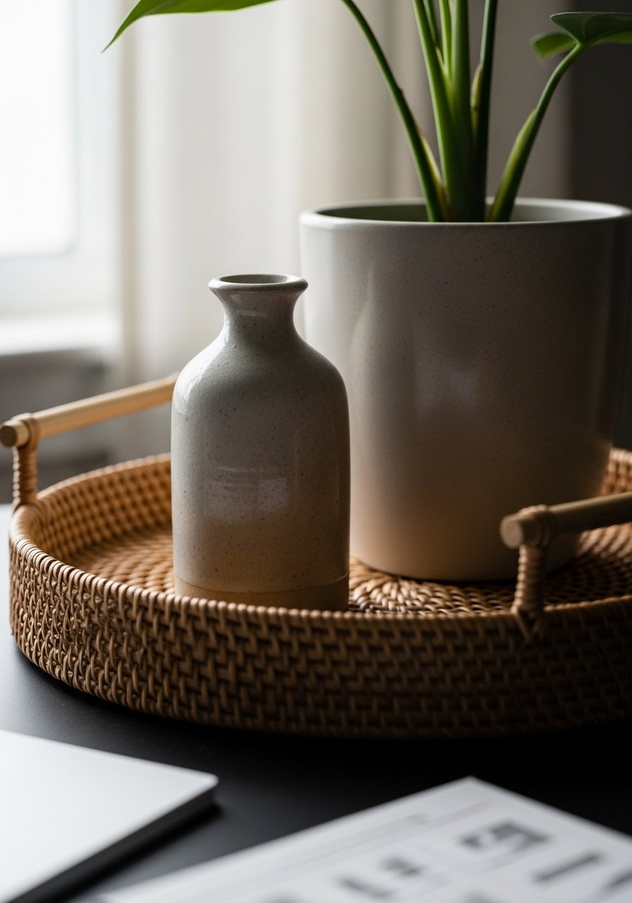 Group three objects in an odd number. I use the woven tray, one ceramic vase, and a small planter. Place the tallest at the back, the medium in the middle, and the shortest in front. That stepped arrangement reads clean from a distance.