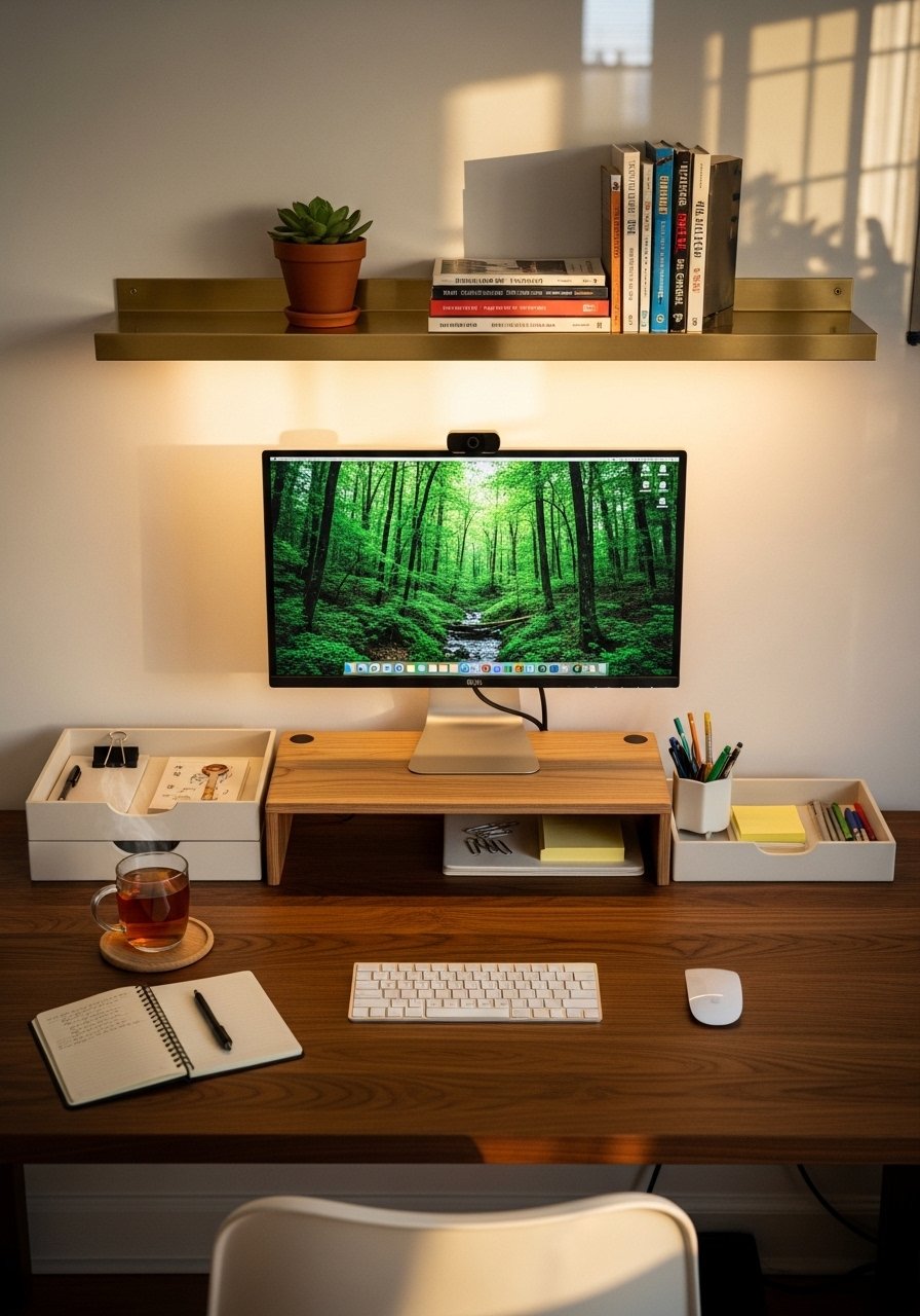 Raise your monitor on a wooden riser. It frees space underneath for a keyboard or a slim notebook. The riser also gives the desk vertical layers. I slip a stackable tray under mine. It holds current papers and keeps piles tidy.