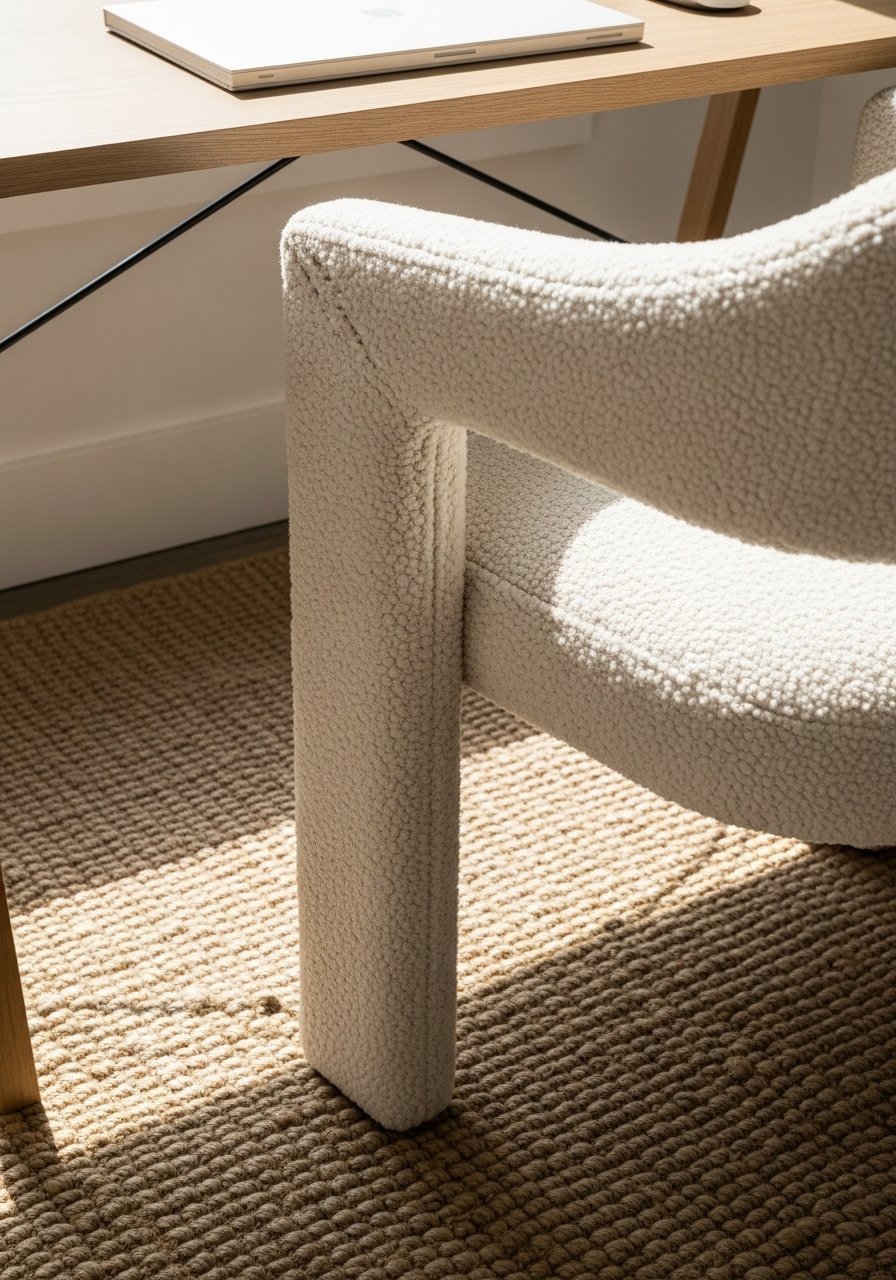 People miss that the rug should sit under both the desk and the front legs of the chair. Small mistake: choosing a rug too small so the desk looks like it’s floating. I pick natural textures for a warm, organic modern feel.