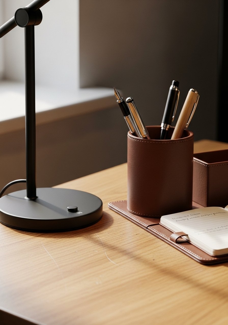 I place an adjustable desk lamp to one side so task light is separate from overhead lighting. That single move makes the work spot feel purposeful. I keep a slim leather organizer on the opposite side so the surface looks tidy without feeling staged.