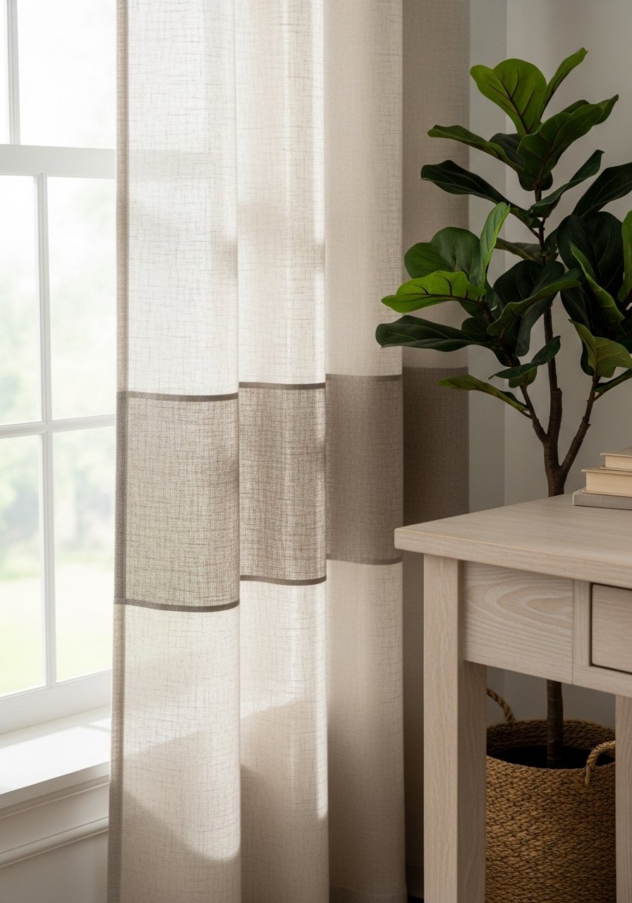 The visual change is immediate: softer light and a layered, lived-in look. Insight: textiles don’t have to match; they should speak the same color family. Mistake to avoid: using curtains that are too short—panels should just kiss the floor or puddle slightly for a relaxed feel.