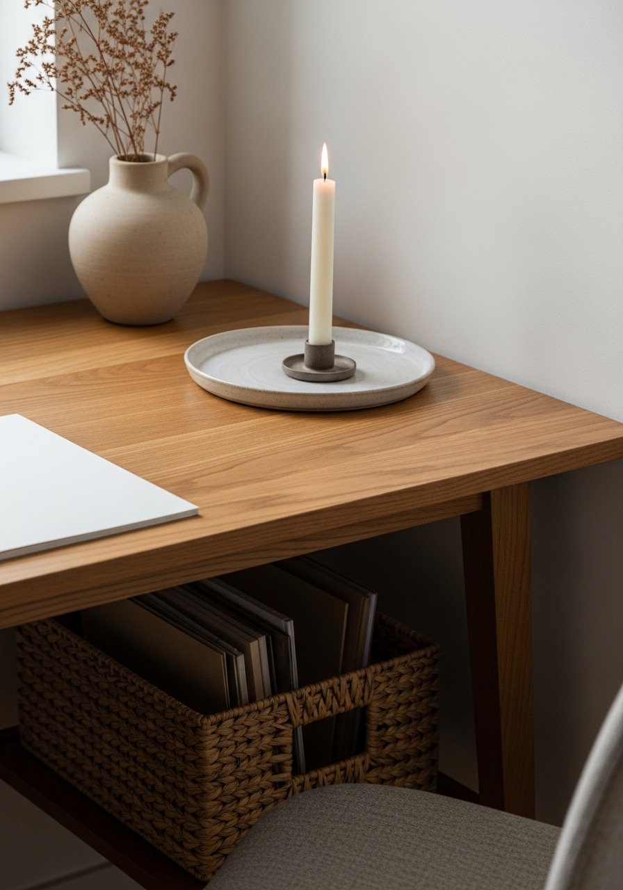 I finish by arranging small vignettes—tray, candle, one framed photo—on the shelf or desk corner. I tuck papers and cables into woven baskets so storage looks intentional, not an afterthought.