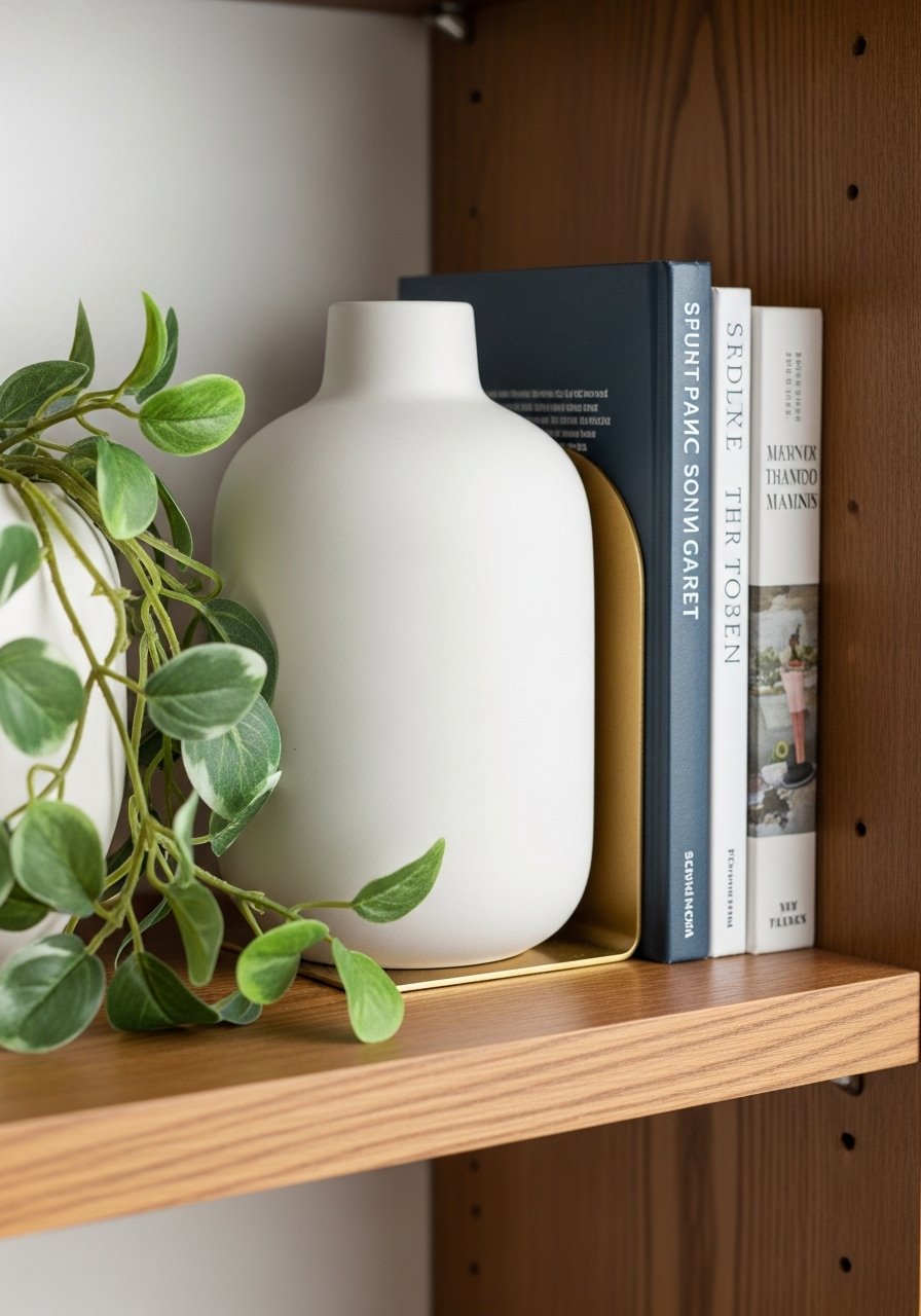 I blend styles by repeating tone and texture. If your room leans mid-century, add a brass bookend with a walnut shelf. If you’re in an organic modern space, favor matte ceramics and natural fibers.