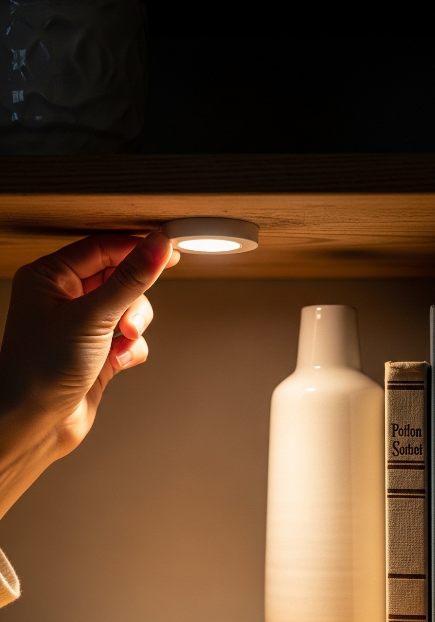 - Warm white battery LED puck lights, 3-pack (~$15–30)