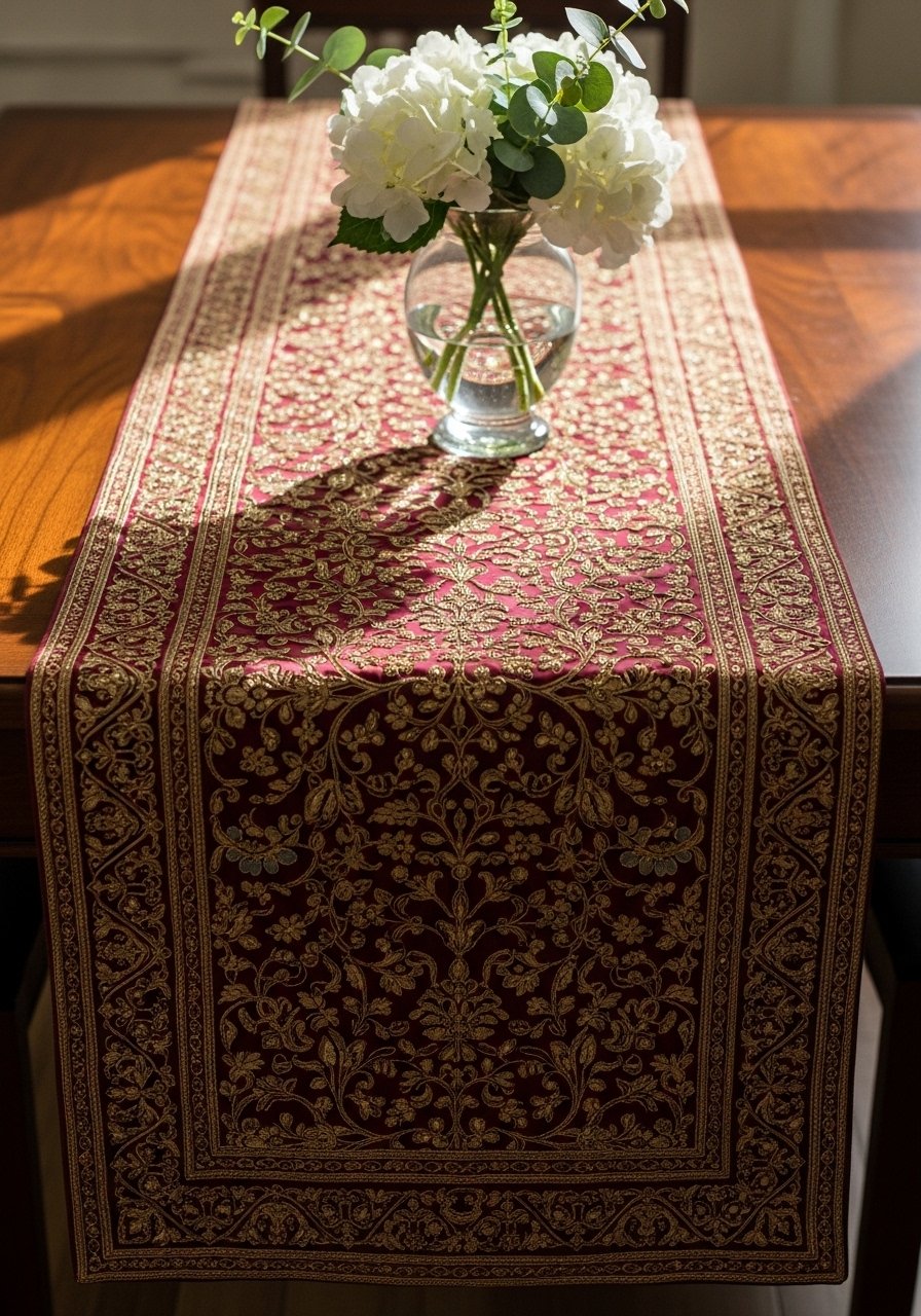 I work out the length by laying the textile and stepping back. I prefer the ends to fall about 6–12 inches over the table for most dining tables. That subtle overhang makes the runner feel anchored without dominating the space.