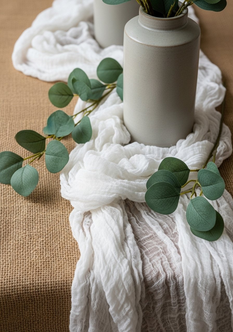 I layer smaller textiles or trim over the base runner when I want depth. A gauze throw over linen softens edges. A wood bead garland or a slim eucalyptus strand adds height and a living feel. I think in layers: base, mid, and focal piece.