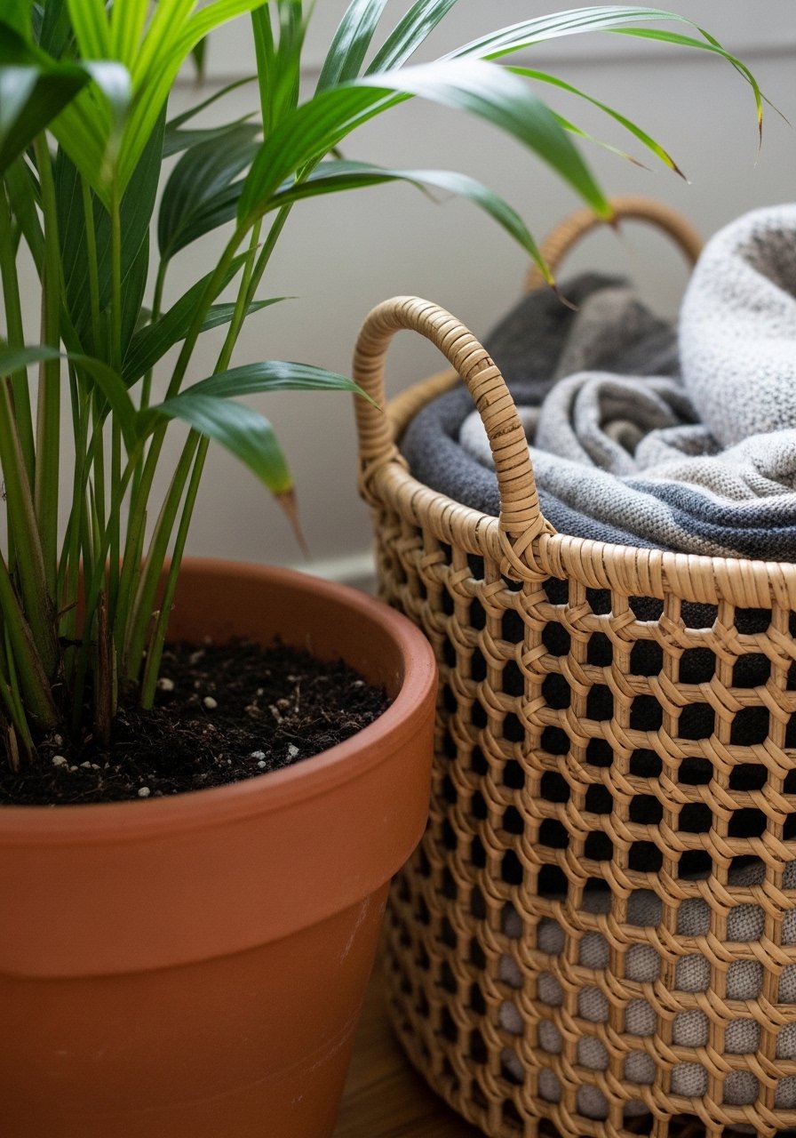 Plants add life and vertical movement. I place a tall plant in a rattan basket in one corner and smaller pots on a shelf or side table. Terracotta warms the palette and pairs well with woven fibers.
