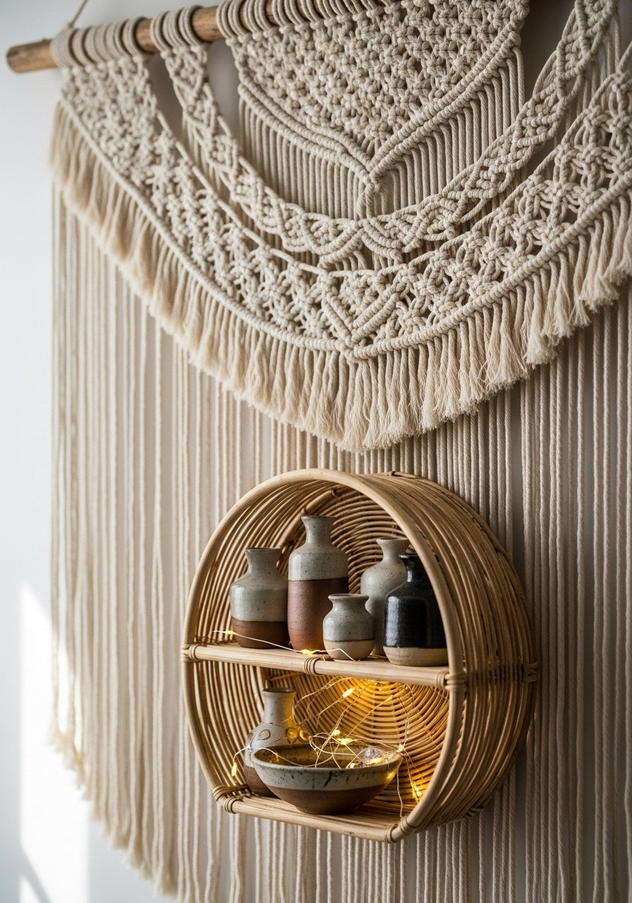 I lean into vertical interest with a macramé piece and a small woven shelf. I hang the macramé off-center and balance it with a shelf that holds a couple of pottery pieces and a trailing plant.
