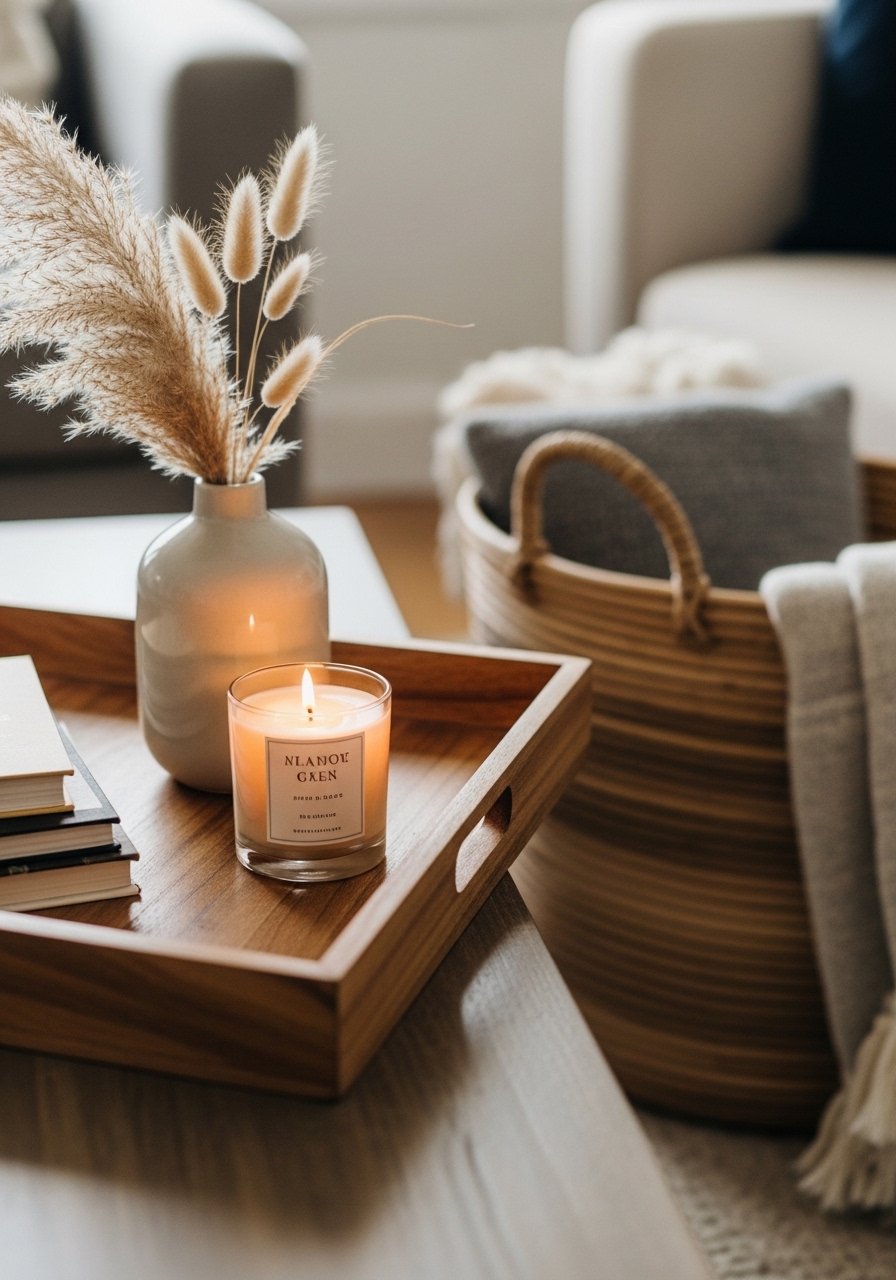 I group items on a tray to create a calm vignette. A small tray, a candle, a book, and a sprig of pampas grass look curated. Nearby, a rattan basket holds blankets to keep things useful and soft.