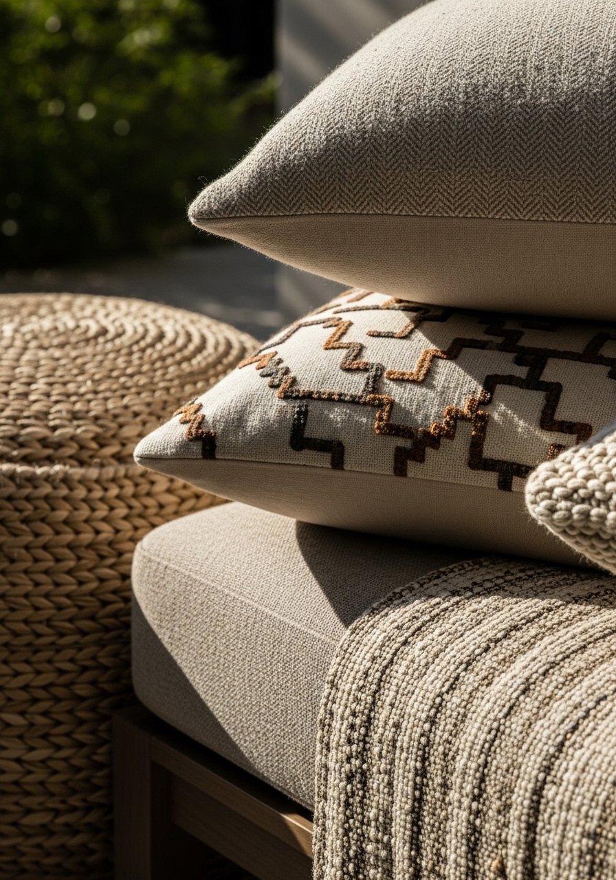 What changes visually is depth: patterns and solids push the eye and anchor a focal spot. A common miss is too many small pillows—stick to one or two per seat. Also avoid indoor-only fabrics; choose fade- and mildew-resistant covers so colors stay true through sun and rain.