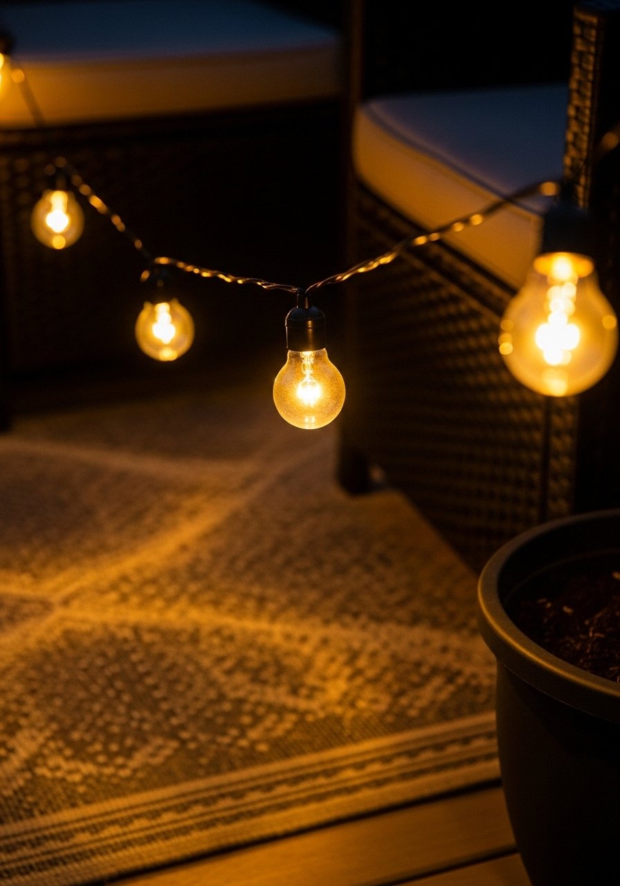 I drape solar string lights along the outer edge or between posts so light washes the seating area. I layer with a lantern on the side table for pockets of brighter light. The difference is immediate: the space goes from usable to inviting after dusk.