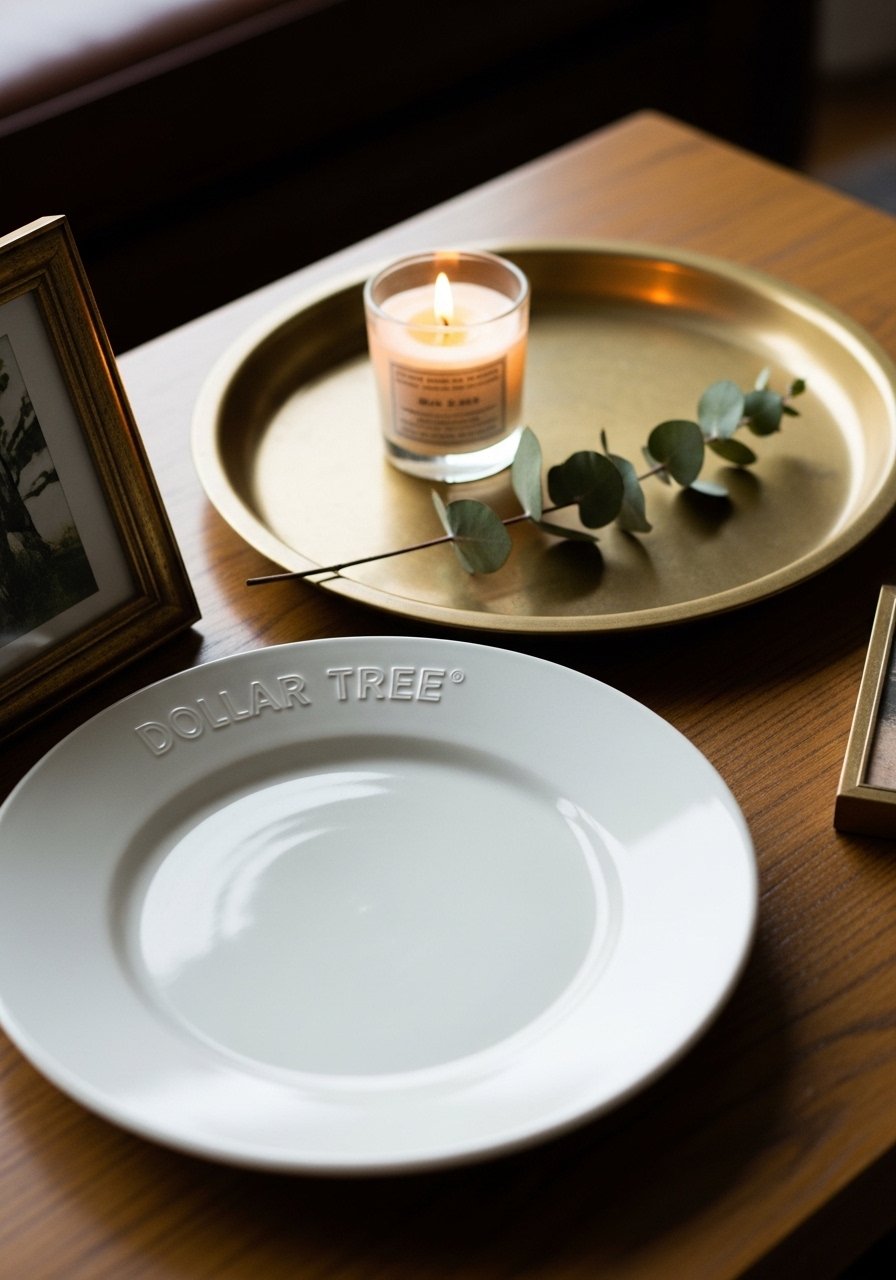 I always choose one quality anchor—like a brass tray or an 8×10 frame—and arrange Dollar Tree pieces around it. The anchor grounds the vignette and sets a material tone.
