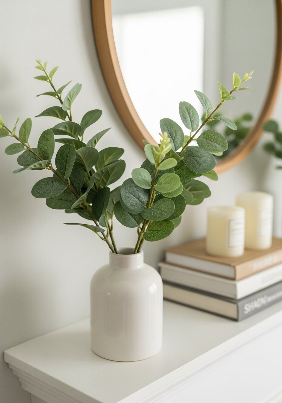 I tuck a few faux eucalyptus stems into a simple vase to add height and life. Greenery gives scale and softens hard lines. The vignette shifts from flat to layered.