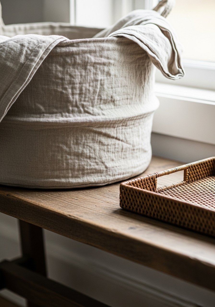 Lay down anchors next. A large linen basket on the floor and a small tray on the bench change how your eye reads the area. Anchors make storage part of the design. I follow a simple rule. One large anchor, one medium stack, and one small decorative object forms a balanced trio.