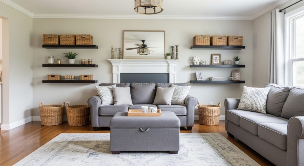 I often see people add storage that competes with the room’s proportions. A huge cabinet in a small space makes the room feel crowded. I fix that by choosing floating shelves or a slim ottoman instead.