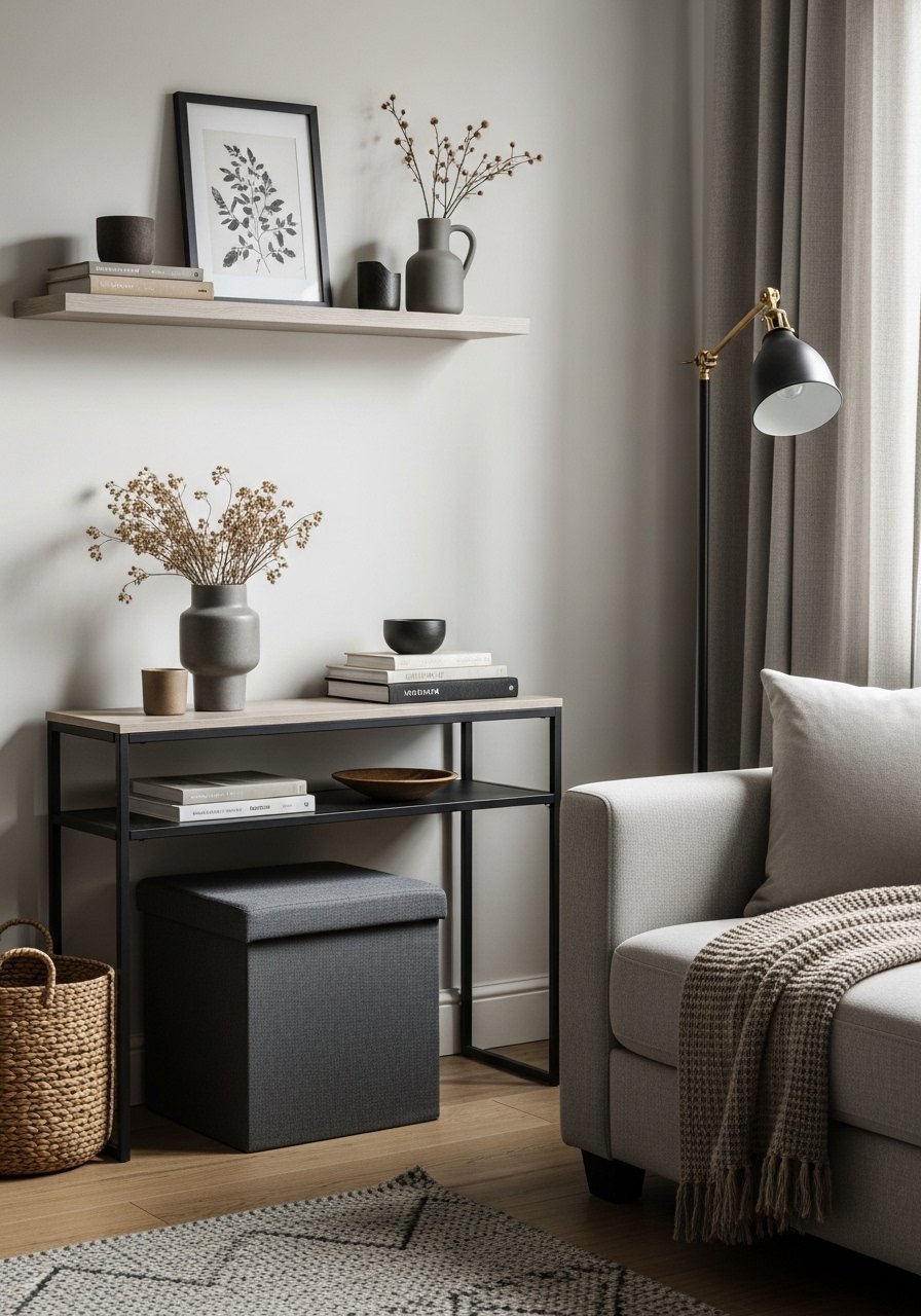 I decide what each corner will do: drop zone, media, reading nook. I place a floating shelf to anchor the eye and a storage ottoman to ground the floor. Visually, the room finally reads as intentional, not improvised. People often forget negative space — letting one shelf breathe makes the whole wall calmer.
